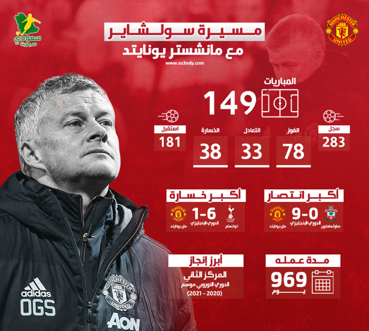 تولى سولشاير، قيادة مانشستر يونايتد بداية من 28 مارس 2019 حتى تمت إقالته اليووم 21 نوفمبر 2021، بواقع 969 يوم.
