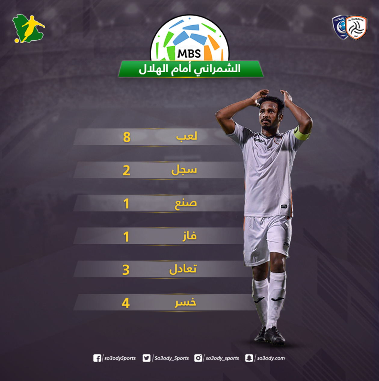 وكان ناصر الشمراني قد واجه الهلال في 8 مباريات سابقة، سجل خلالها هدفين في مباراة واحدة بموسم 2011/12، وصنع هدفًا في الموسم الماضي.