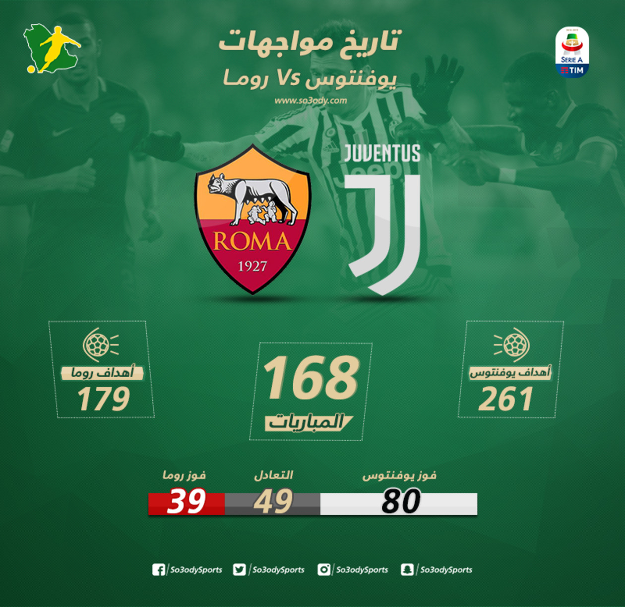 لعب الفريقان، 168 مباراة، حقق خلالها يوفنتوس 80 انتصارًا، مقابل 39 لروما، بينما حسم التعادل 49 لقاءً.