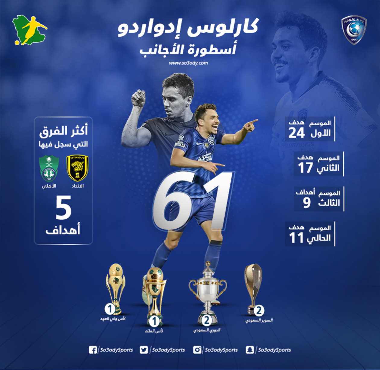 توزعت أرقام إدواردو الـ61 مع الهلال، ما بين 39 في مسابقة الدوري، و11 في دوري أبطال آسيا، بالإضافة إلى 4 في كأس الملك و3 في كأس ولي العهد و2 في كل من كأس السوبر والبطولة العربية.