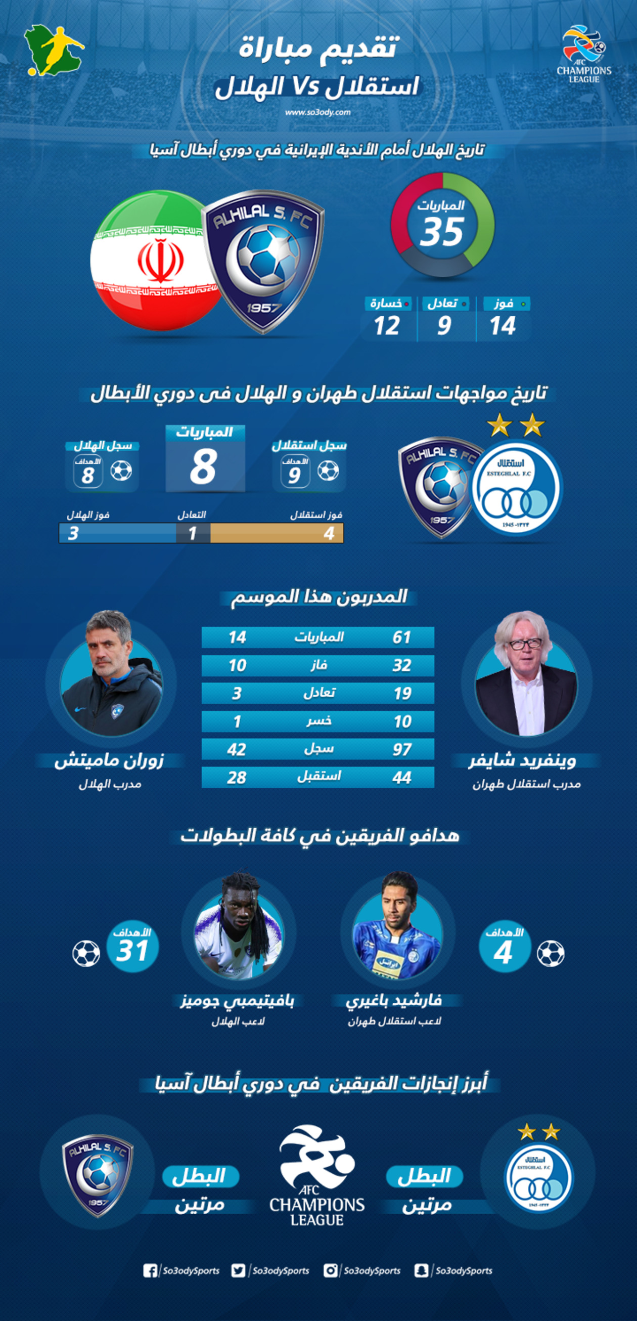 يحل فريق الكرة بنادي الهلال، ضيفًا على استقلال طهران الإيراني، في المباراة التي تجمع بين الفريقين في الثامنة مساء الغد "الإثنين"، على ملعب حمد بن خليفة، ضمن منافسات الجولة الثالثة من مرحلة المجموعات ببطولة دوري أبطال آسيا.