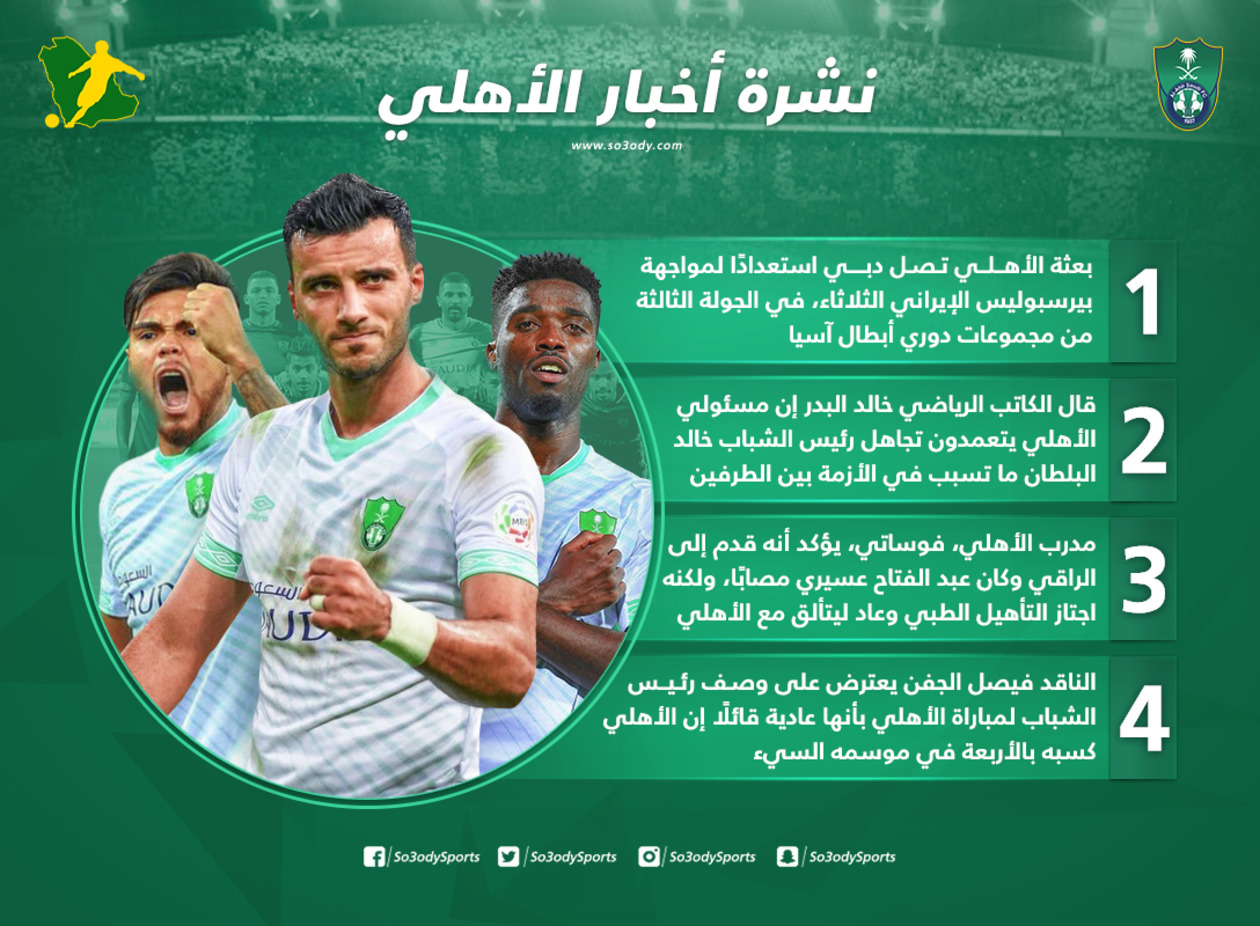 - بعثة الأهلي تصل دبي الإماراتية، استعدادًا لمواجهة بيرسبوليس الإيراني الثلاثاء، في الجولة الثالثة من مجموعات دوري أبطال آسيا.