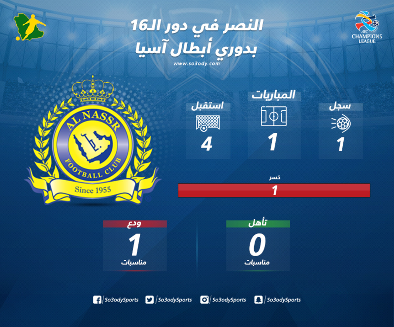 ومنذ اعتماد نظام دور الـ16 في بطولة دوري أبطال آسيا، لم يسبق للنصر أن تأهل لتلك المرحلة سوى مرة واحدة، في نسخة 2011، قبل أن يودع المسابقة، بعد الخسارة أمام ذوب آهن أصفهان الإيراني بنتيجة (4-1)، وكانت المرحلة تقام من مباراة واحدة.