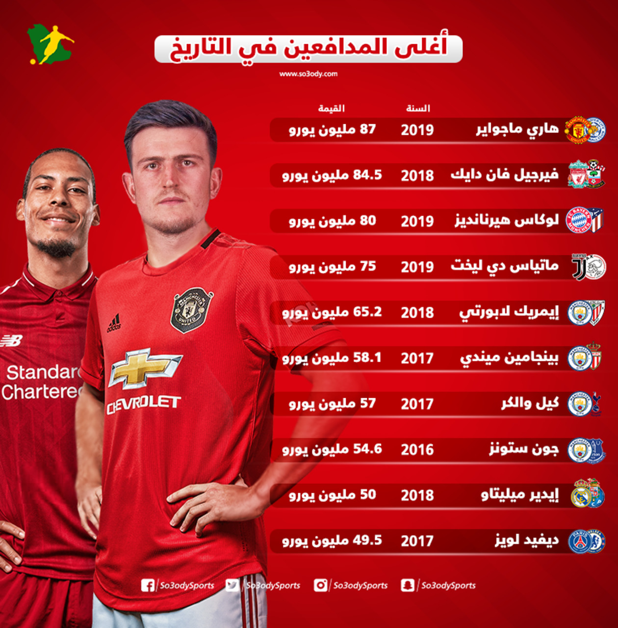 1- هاري ماجواير "ليستر سيتي - مانشستر يونايتد": 87 مليون يورو