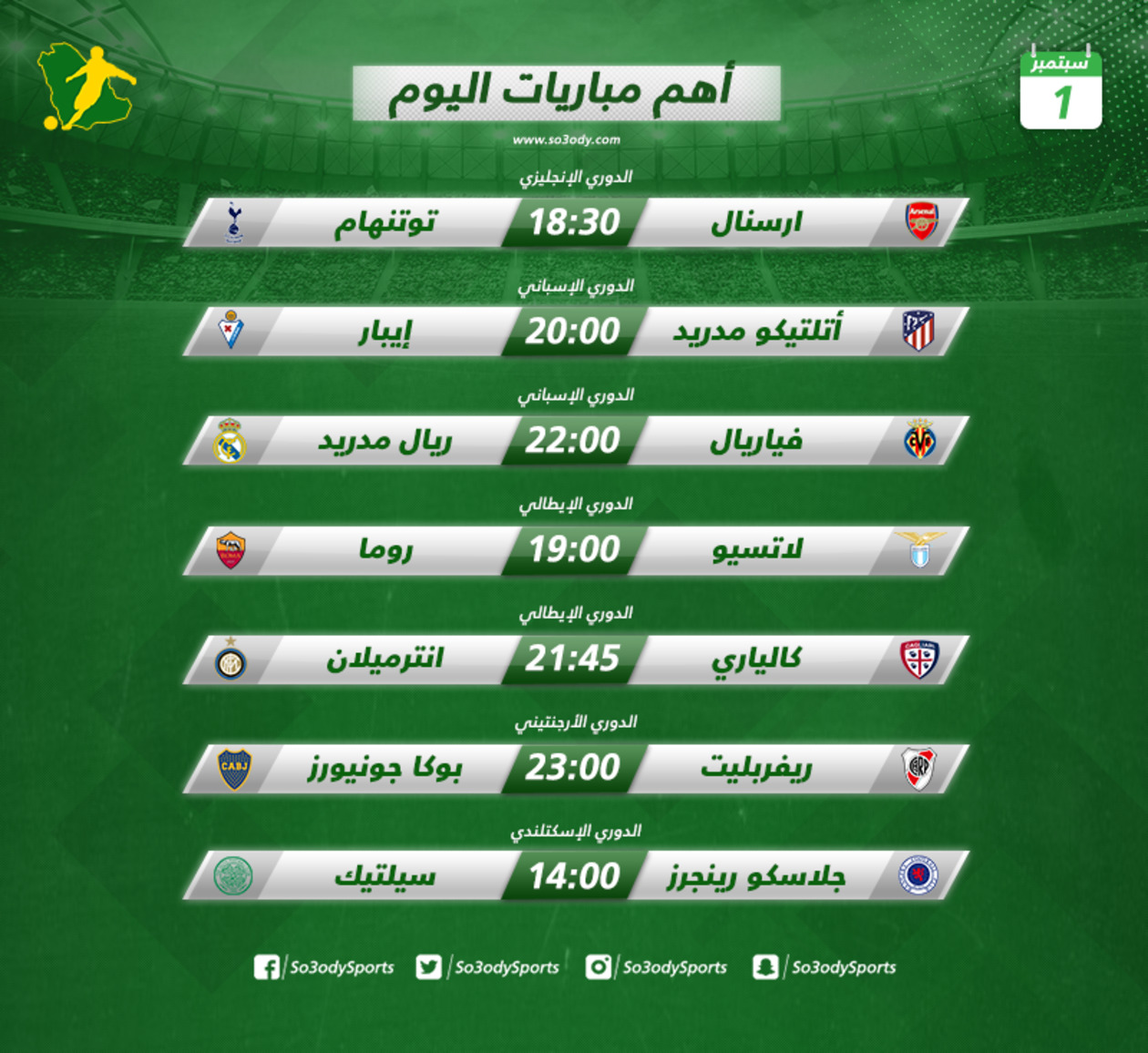 جماهير كرة القدم، أنتم على موعد اليوم الأحد 1 سبتمبر 2019، مع عدد من المباريات الهامة، في مختلف البطولات على مستوى العالم.