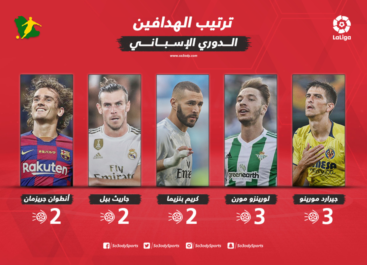 انتهت منافسات الجولة الثالثة من عمر الدوري الإسباني "الليجا"، بتصدر جيرارد مورينو مهاجم فياريال قائمة الهدافين برصيد (3) أهداف، بعد تسجيله هدفا لفريقه في شباك ريال مدريد، في اللقاء حسمه التعادل (2-2).
