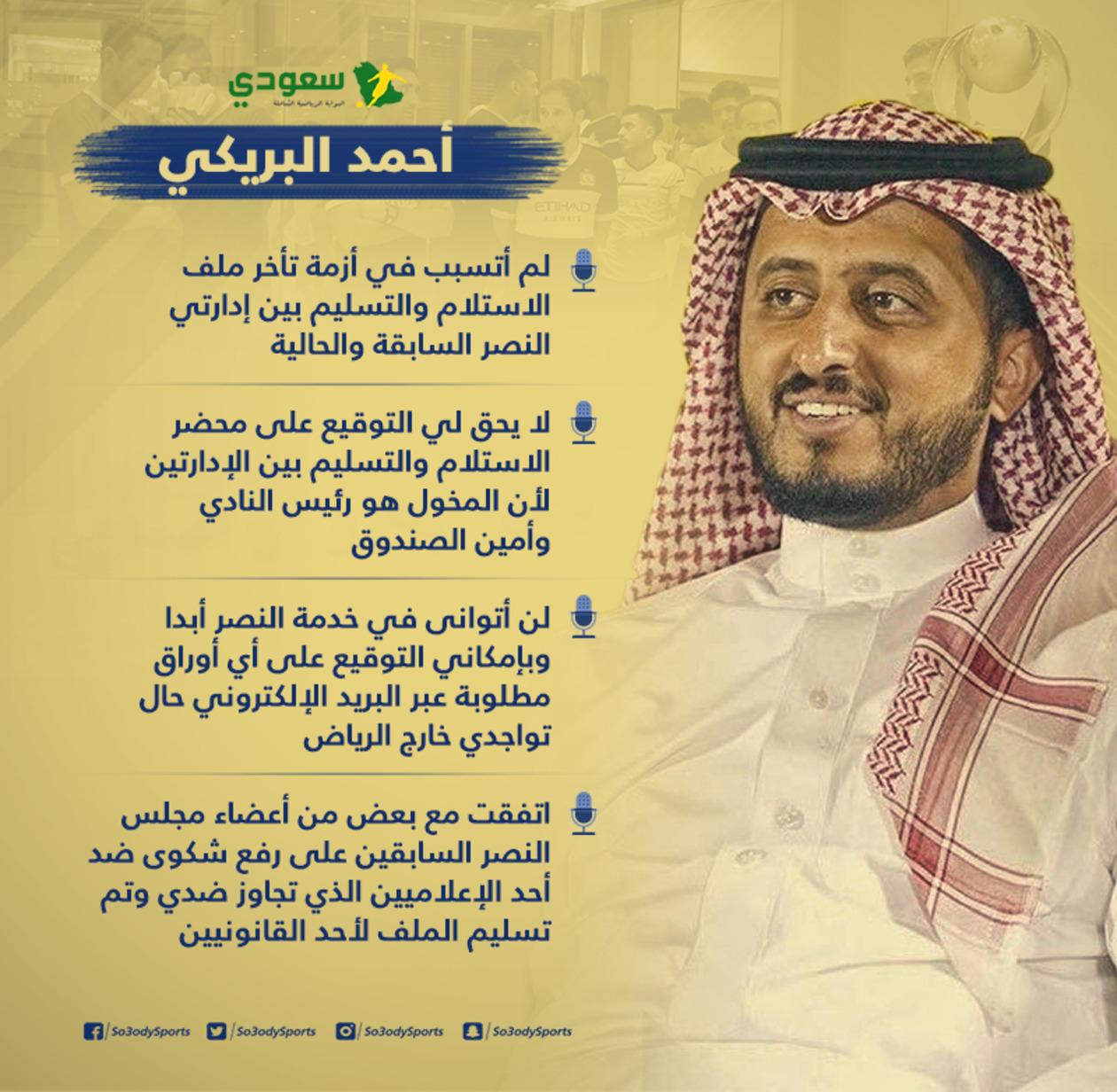 رد أحمد البريكي المدير التنفيذي في نادي النصر، على الاتهامات التي طالته بشأن تسببه في تأخير ملف الاستلام والتسليم بين إدارتي العالمي.