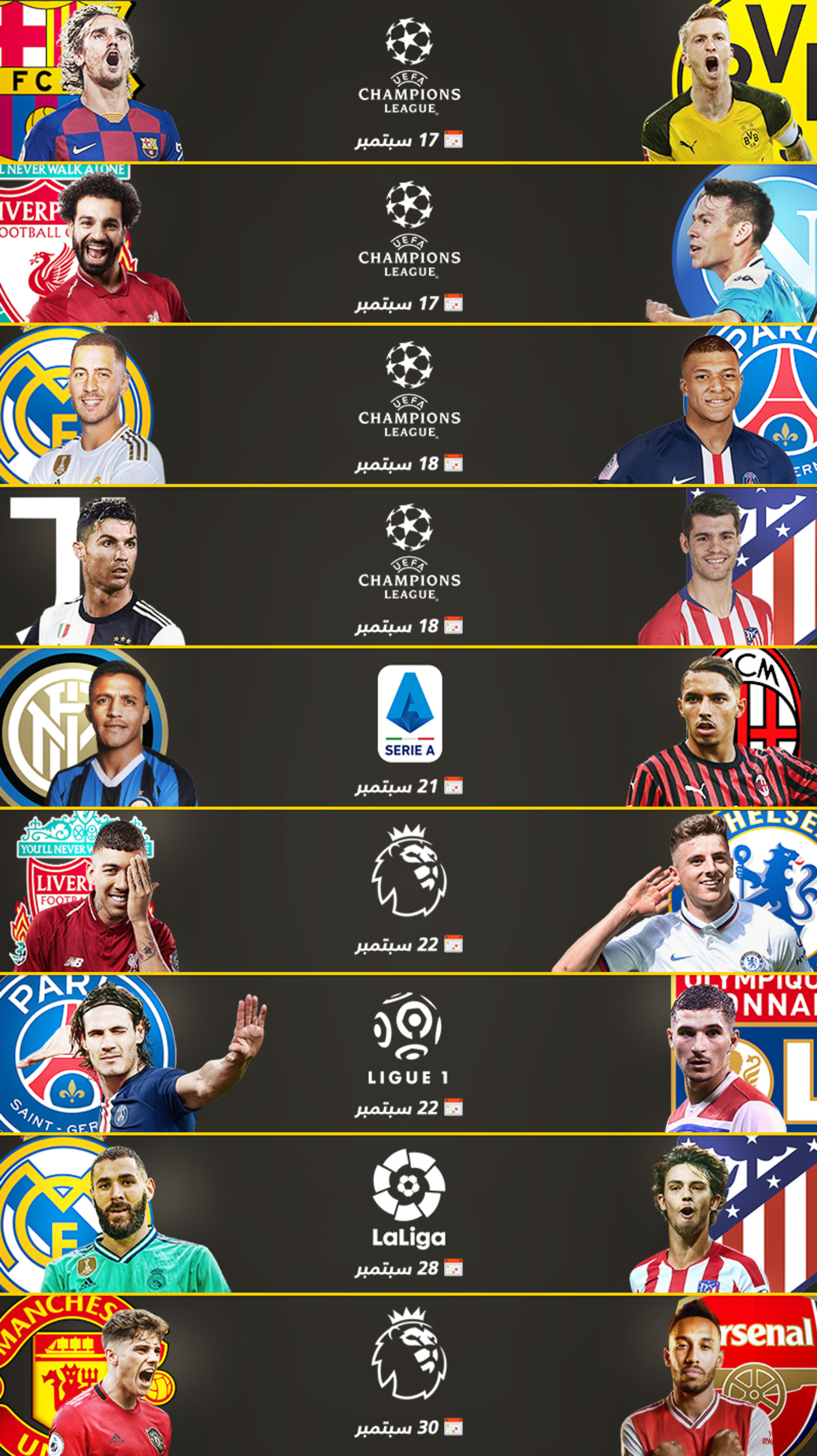 سيكون عشاق الكرة العالمية على موعد مع مجموعة من المواجهات النارية في الدوريات الأوروبية وبداية دوري الأبطال بعد إنتهاء التوقف الدولي.
