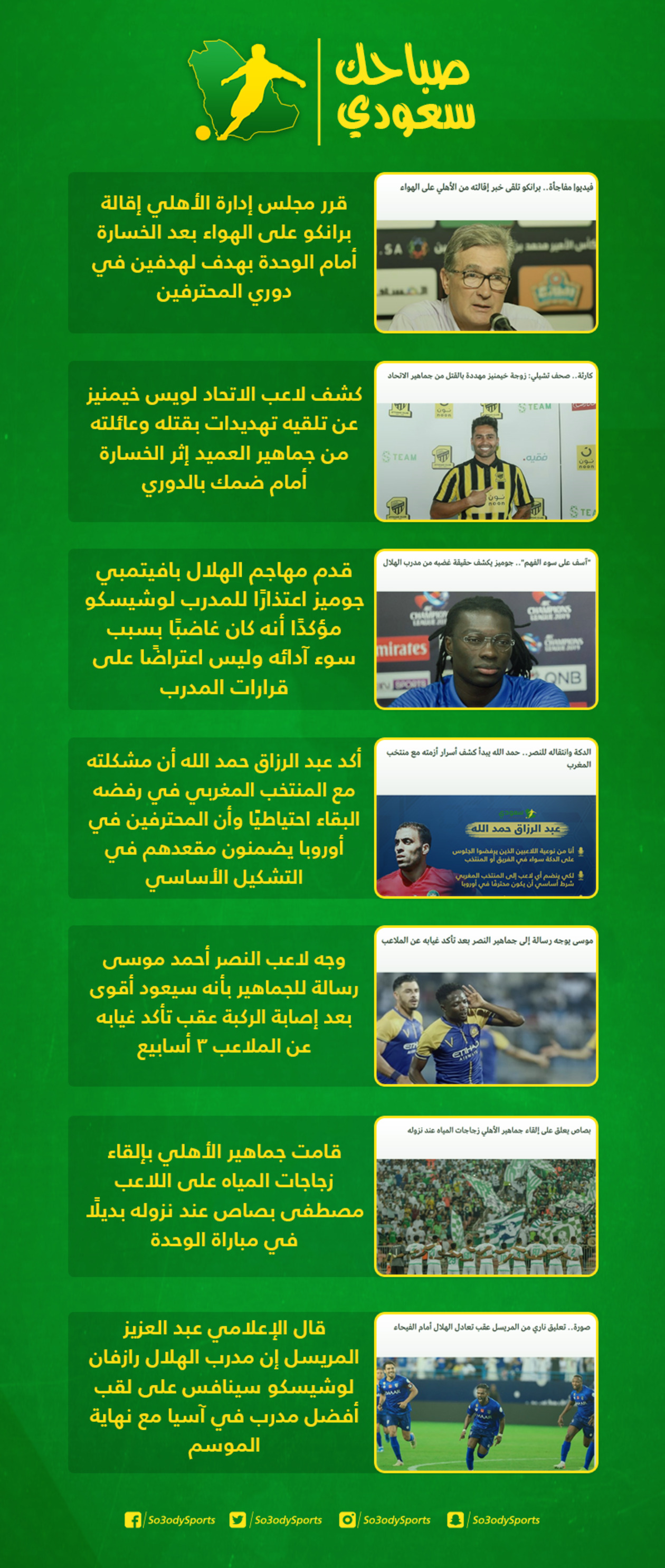 شهدت الساحة الرياضية المحلية والعالمية، خلال الـ24 ساعة المنقضية، عددًا من الأخبار التي حرص "سعودي سبورت" على الاهتمام بها، وتقديمها لمتابعيه، من أجل إلمامهم بالأحداث أول بأول.