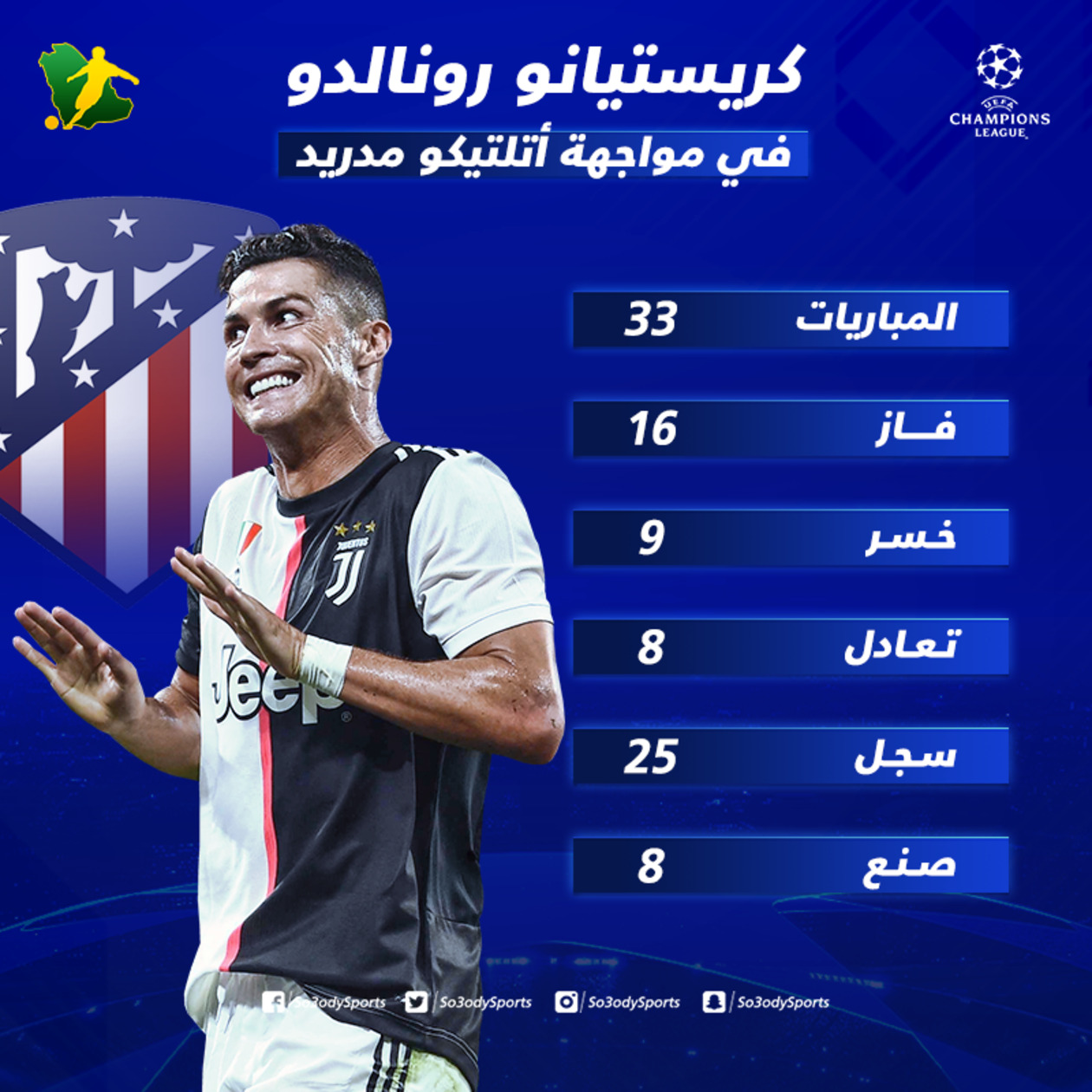 وفاز رونالدو بـ16 مواجهة سابقة ضد أتلتيكو وخسر في 9 مناسبات، فيما حسم التعادل 8 مباريات سابقة للنجم البرتغالي ضد خصم الغد.