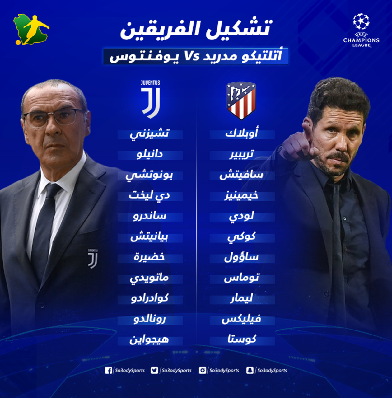 أعلن ماوريسيو ساري المدير الفني ليوفنتوس تشكيل فريقه الأساسي الذي سيواجه مضيفه أتلتيكو مدريد الإسباني، في الجولة الأولى من دور المجموعات بدوري أبطال أوروبا.