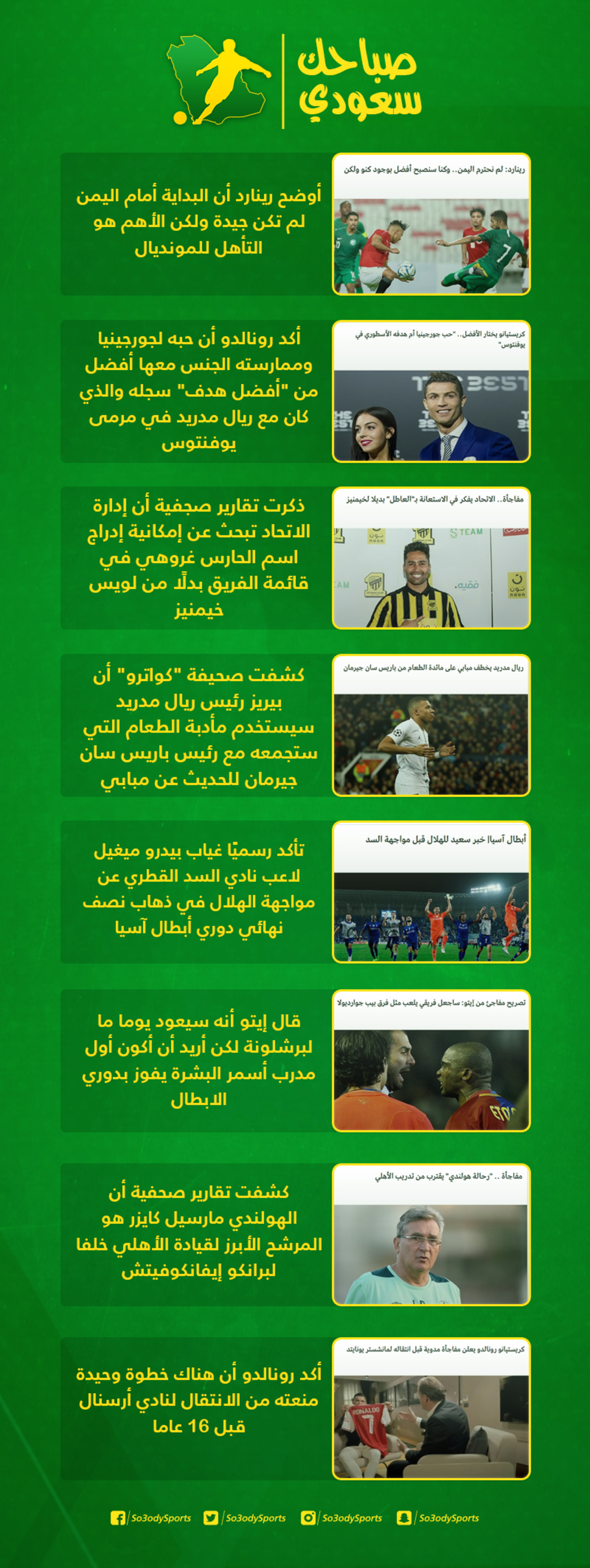 شهدت الساحة الرياضية المحلية والعالمية، خلال الـ24 ساعة المنقضية، عددًا من الأخبار التي حرص "سعودي سبورت" على الاهتمام بها، وتقديمها لمتابعيه، من أجل إلمامهم بالأحداث أول بأول.