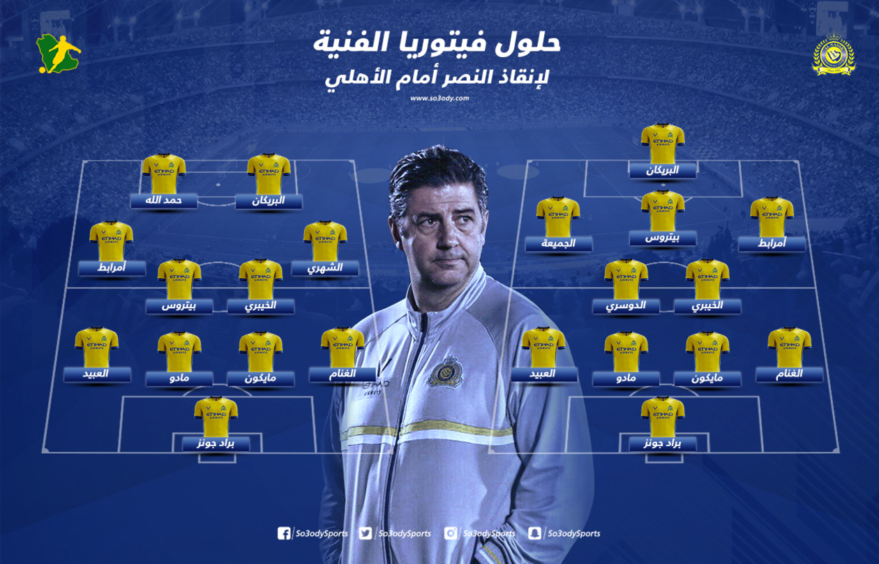 يبقى الحل الثاني أمام فيتوريا أن يقوم بتعديل طريقة اللعب والاستغناء عن طريقته المعتادة "4-2-3-1"، وقد يلجأ مدرب النصر للاعتماد على طريقة 4-4-2، حال تأكد مشاركة حمدالله.