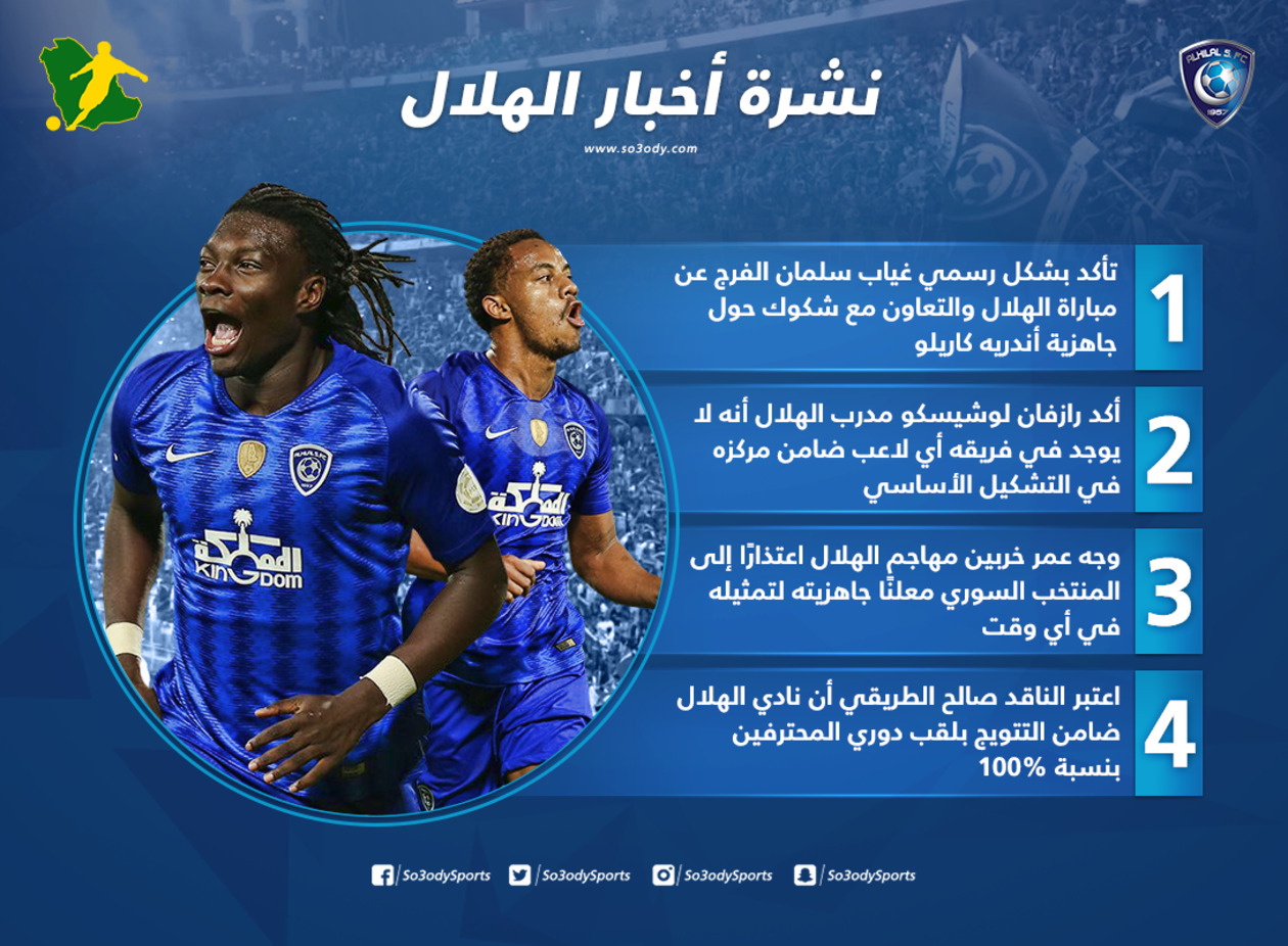 تأكد بشكل رسمي، غياب سلمان الفرج، نجم خط وسط نادي الهلال، عن مواجهة التعاون، ضمن منافسات الجولة الخامسة من مشابقة الدوري، مع شكوك حول جاهزية البيروفي أندريه كاريلو.