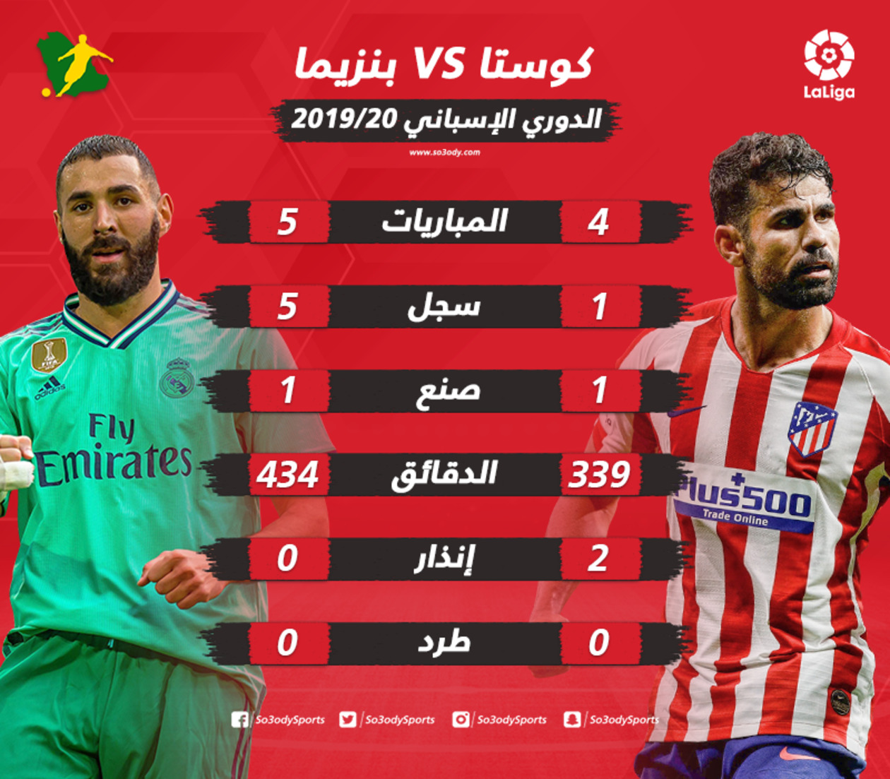 وسجل كوستا هدف وحيد وصنع أخر في 4 مباريات لعبها في الليجا حتى الآن، فيما سجل بنزيما 5 أهداف ليكون هداف الليجا بالمناصفة مع لاعبين وصنع هدف أيضا.