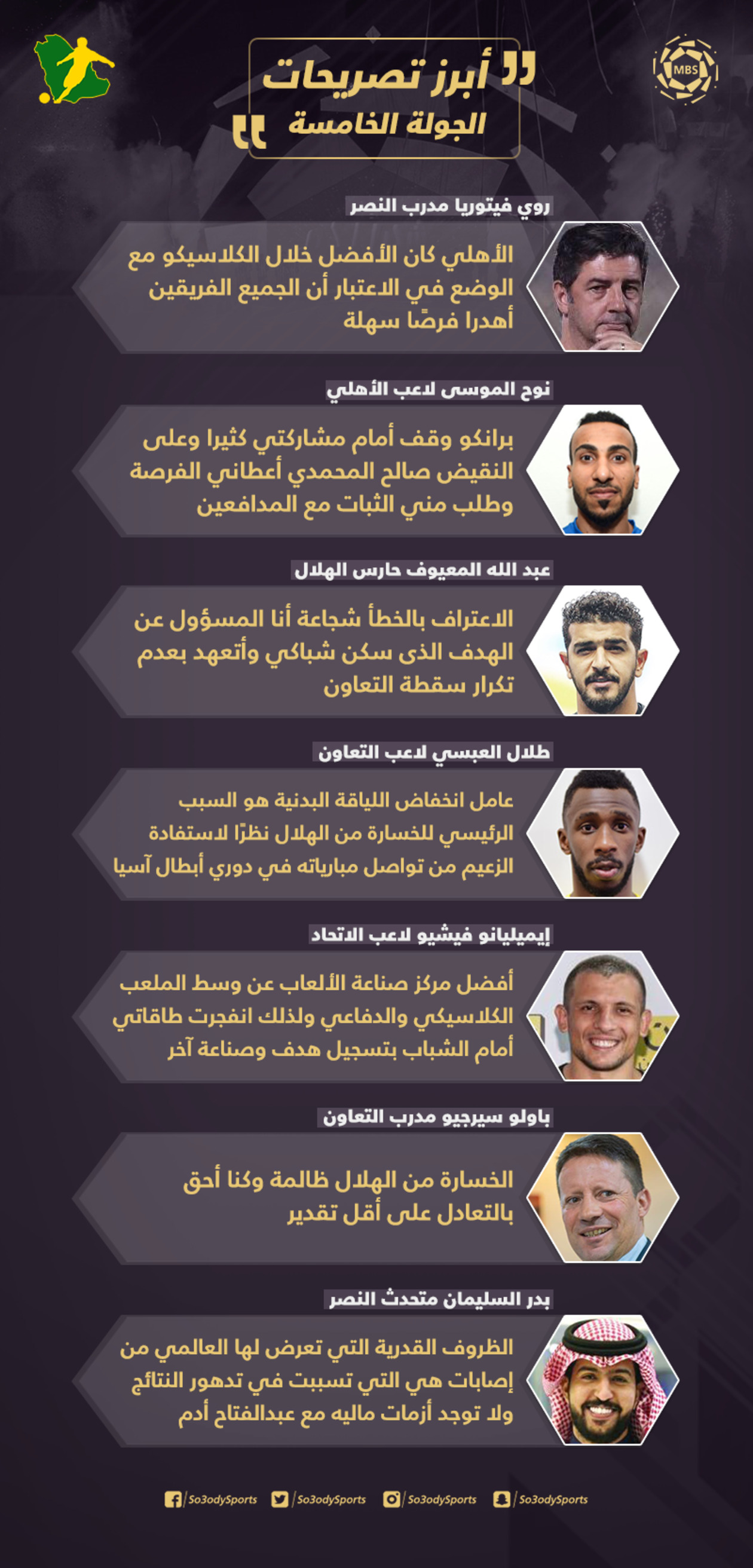 ويستعرض "سعودي سبورت" أبرز التصريحات بعد مباريات الجولة الخامسة من الدوري السعودي للمحترفين.