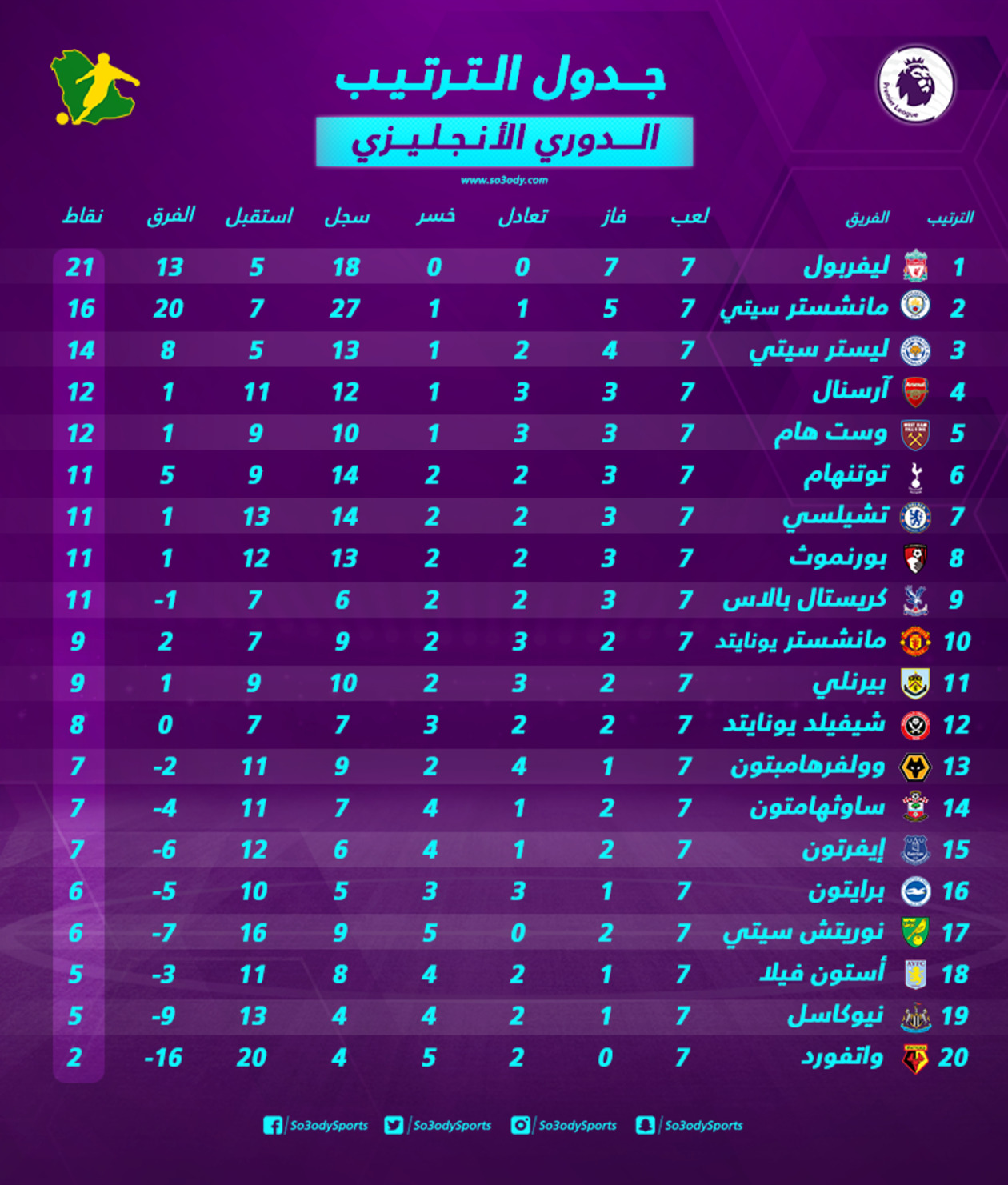 جدول ترتيب البريميرليج بعد الجولة السابعة.. ليفربول يغرد خارج السرب وصحوة تشيلسي