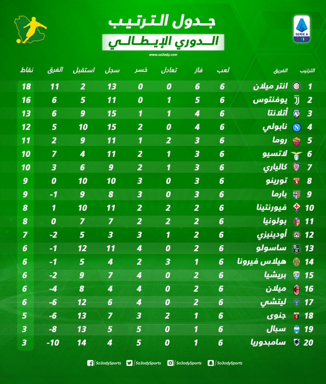 ترتيب الدوري الإيطالي بعد الجولة السادسة.. انتر يواصل الانطلاقة مع كونتي وكوارث للغريم ميلان