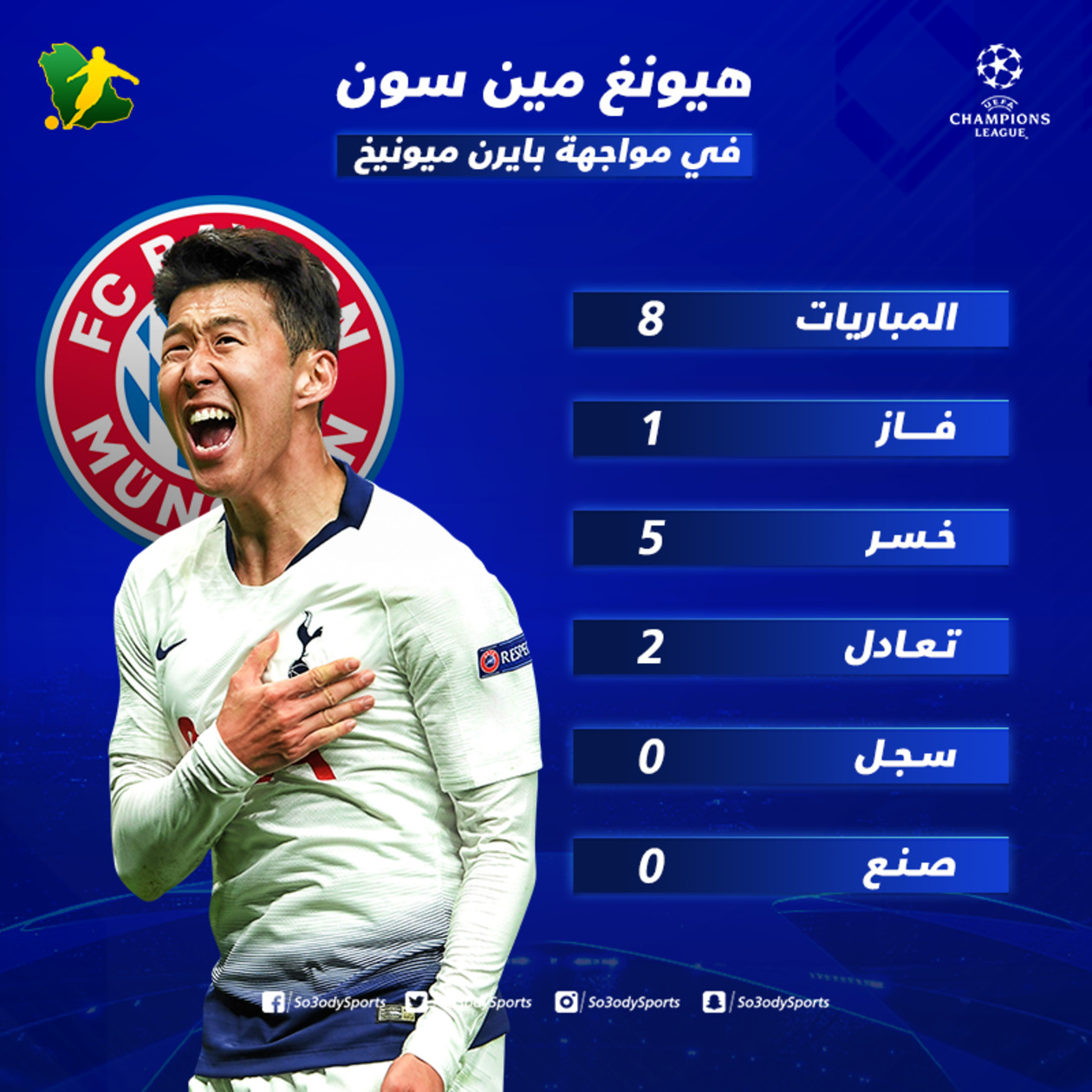 ويمتلك سون سجلاً كارثياً بكل المقاييس في مواجهاته السابقة مع بايرن من خلال انتصار وحيد، تعادلين و5 خسائر، كما لم ينجح في تسجيل أو صناعة أي أهداف أمامهم.