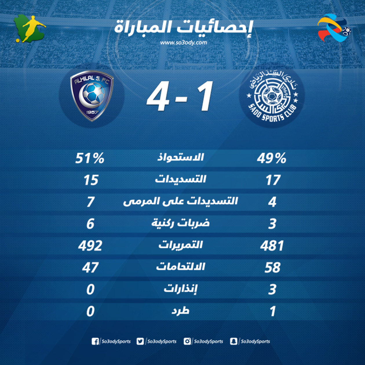 وقام لاعبو السد بـ58 التحامًا في المباراة، مقابل 47 للهلال، مع حصولهم على 3 إنذارات وكارت أحمر.