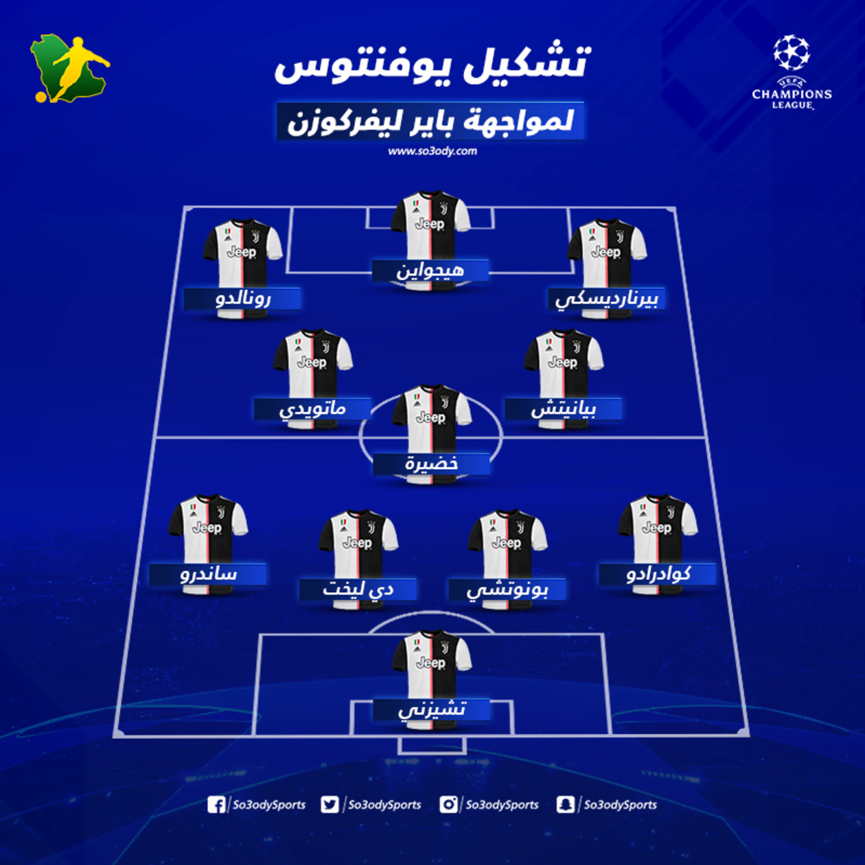 أعلن ماوريسيو ساري المدير الفني ليوفنتوس، تشكيل فريقه الأساسي الذي سيواجه ضيفه بايرن ليفركوزن الألماني، في إطار منافسات الجولة الثانية لدور المجموعات بدوري أبطال أوروبا.
