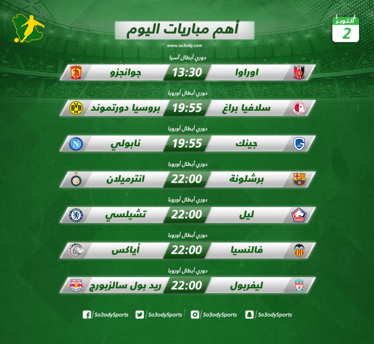 جماهير كرة القدم، أنتم على موعد اليوم الأربعاء 2 أكتوبر 2019، مع عدد من المباريات الهامة، في مختلف البطولات على مستوى العالم.