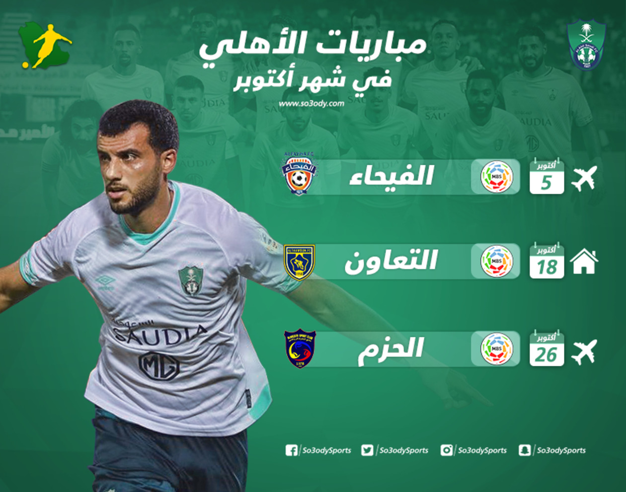 ويخوض الأهلي 3 مباريات في أكتوبر، خلال مسابقة دوري كأس الأمير محمد بن سلمان للمحترفين.