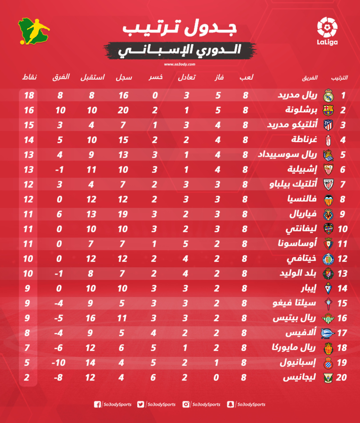 جدول ترتيب الدوري الإسباني بعد انتهاء الجولة الثامنة.. برشلونة يواصل مطاردة ريال مدريد