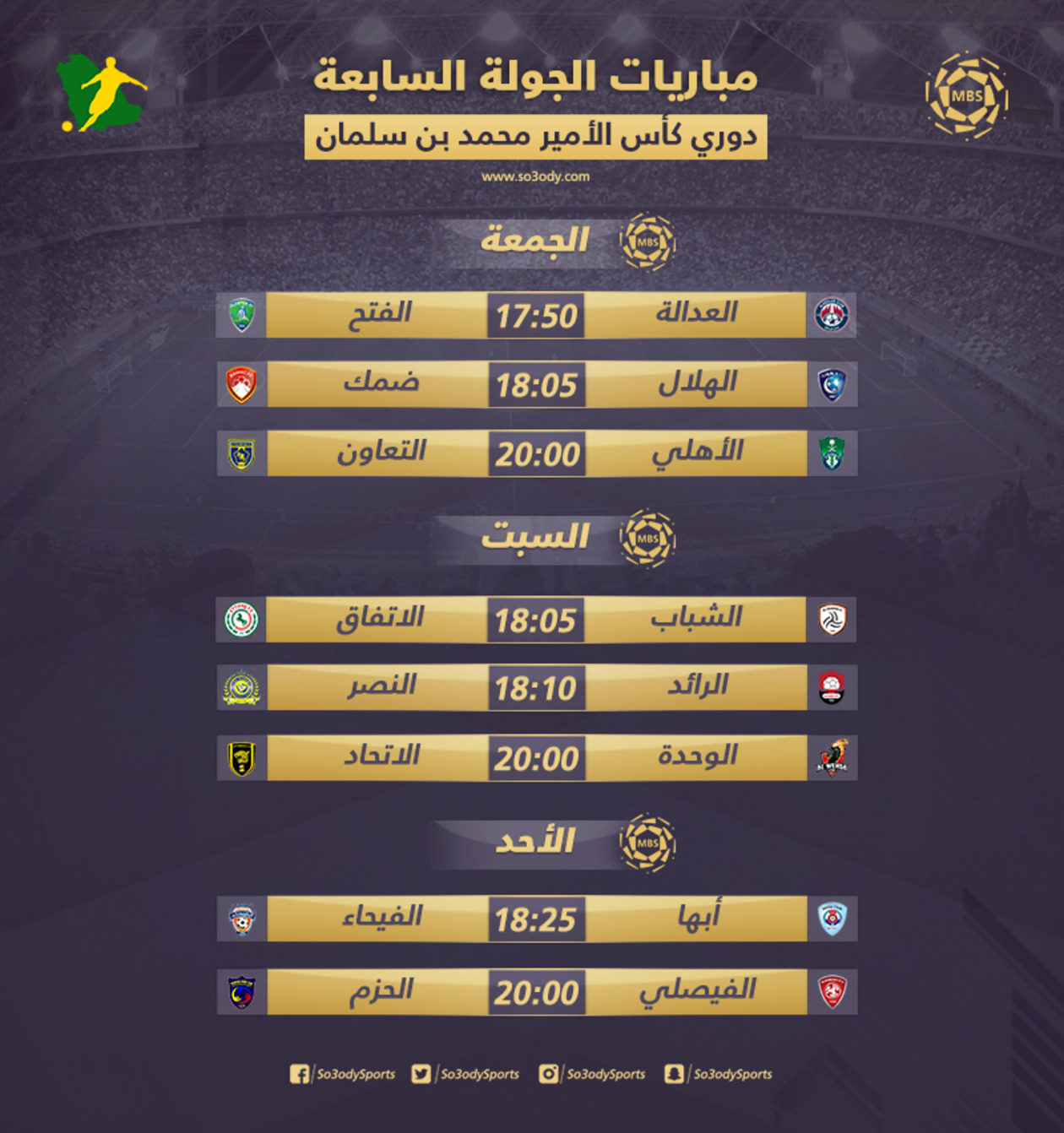 تنطلق غدًا "الجمعة"، مباريات الجولة السابعة من مسابقة دوري كأس الأمير محمد بن سلمان للمحترفين، والتي تشهد عودة المسابقة، بعد توقف استمر 13 يومًا من أجل المباريات الدولية.