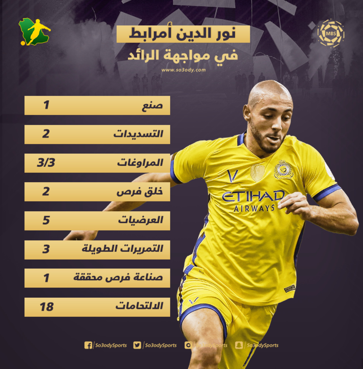 قاد الدولي المغربي نور الدين أمرابط لاعب وسط نادي النصر، فريقه للفوز أمام مضيفه الرائد بهدفين دون رد، ضمن مباريات الجولة السابعة لدوري كأس الأمير محمد بن سلمان للمحترفين.
