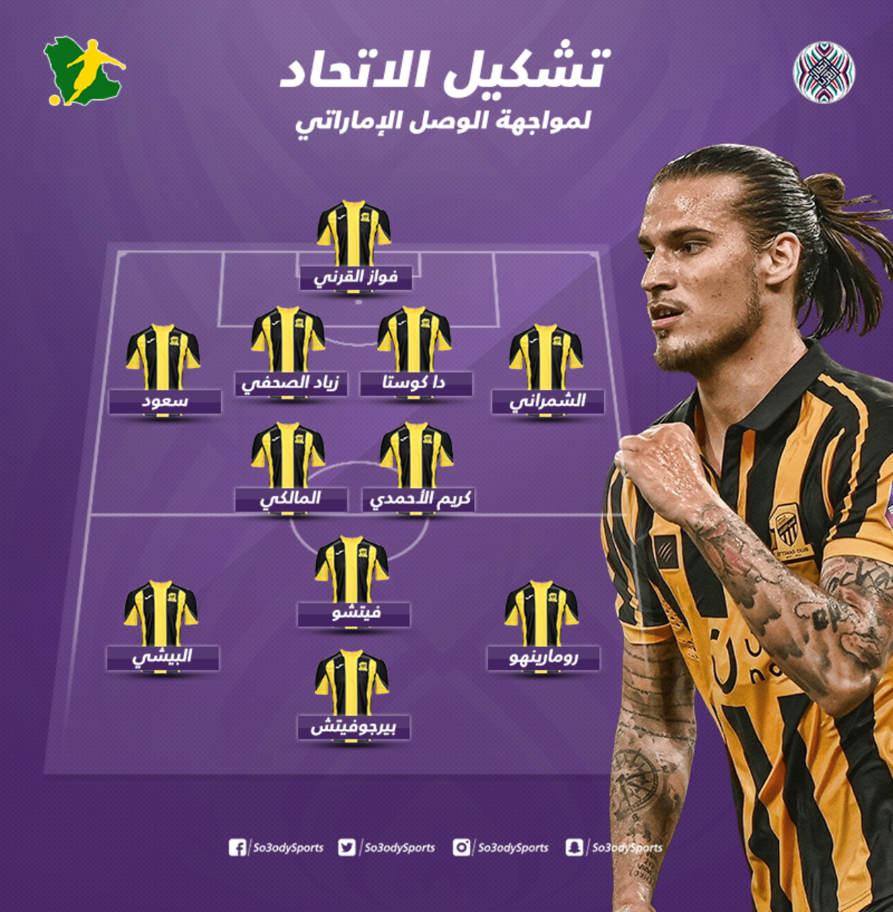 وتشهد تشكيلة الاتحاد عودة المغربي مروان دا كوستا الذي غاب عن الفريق خلال الفترة الماضية بسبب الإصابة.