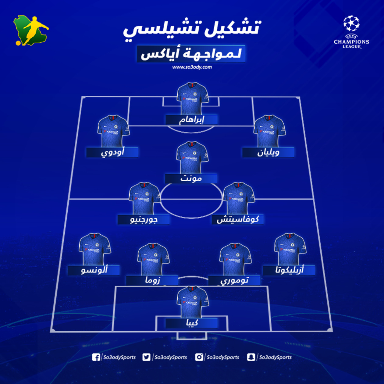 وأعلن المدير الفني فرانك لامبارد، مدرب البلوز، رسميًا تشكيل فريقه الساعي إلى تحقيق الفوز، ومواصلة المستويات المذهلة التي يقدمها اللاعبون تحت قيادته: