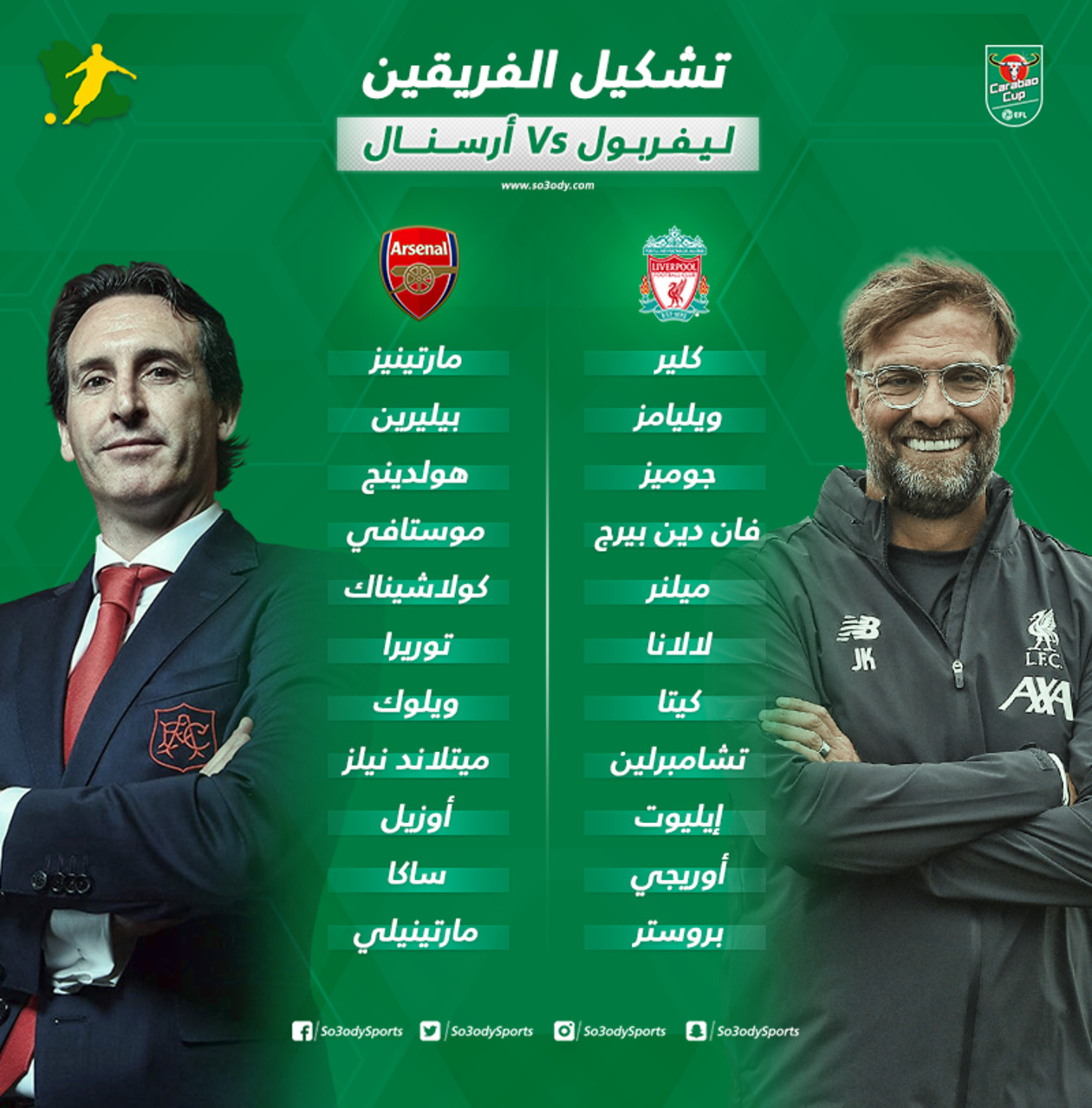 أعلن الألماني يورجن كلوب المدير الفني لليفربول، تشكيل فريقه الأساسي الذي سيواجه ضيفه أرسنال على ملعب أنفيلد رود، في إطار منافسات دور الـ 16 من كأس الرابطة المحترفة "كاراباو".