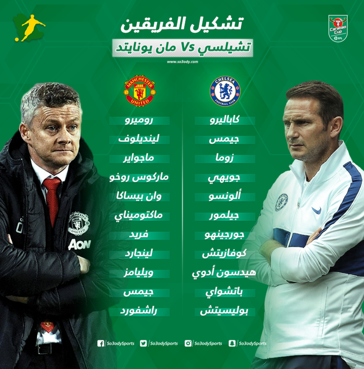 أعلن فرانك لامبارد المدير الفني لتشيلسي، تشكيل فريقه الأساسي الذي سيواجه ضيفه مانشستر يونايتد، في قمة مباريات دور الـ 16 من كأس الرابطة المحترفة "كاراباو".