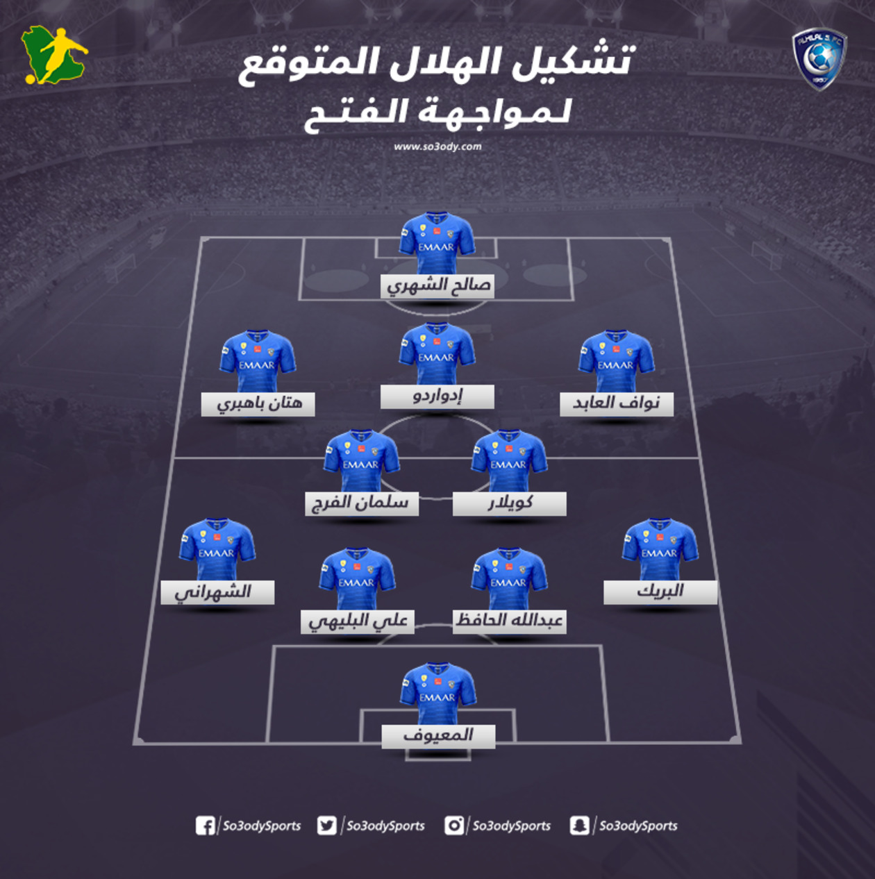 ويغيب عن الهلال في مباراة الفتح ، كل من جيوفينكو، وسالم الدوسري، ومحمد كنو، وهيون سو.
