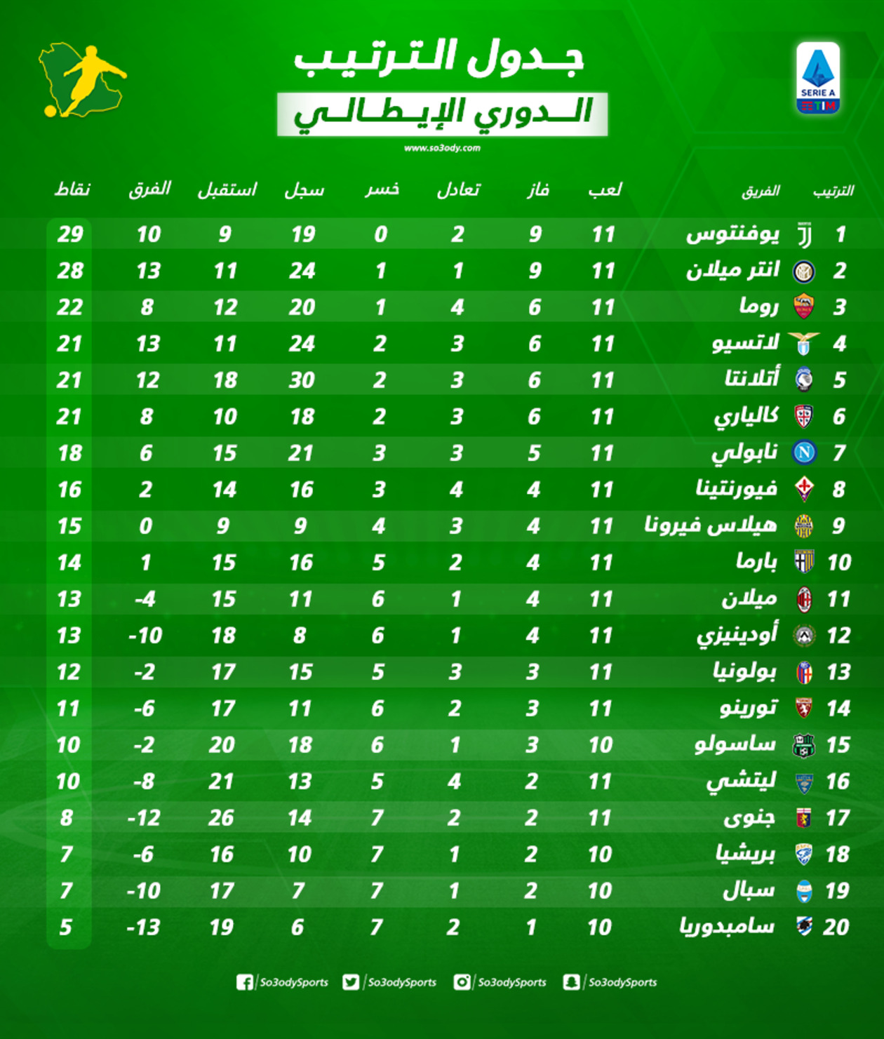 وتنتهي مواجهات الأسبوع الـ 11، بمباراة سبال وسامبدوريا، والمقرر لها مساء اليوم في استاد باولو موتزا