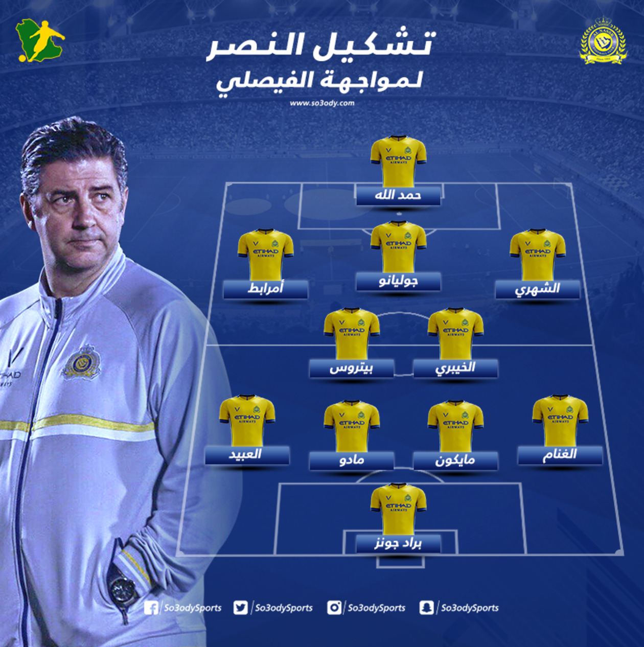 أعلن البرتغالي روي فيتوريا، المدير الفني لفريق الكرة بنادي النصر، عن تشكيل الفريق لملاقاة الفيصلي، في المباراة المؤجلة من الجولة السادسة من مسابقة دوري كأس الأمير محمد بن سلمان للمحترفين.