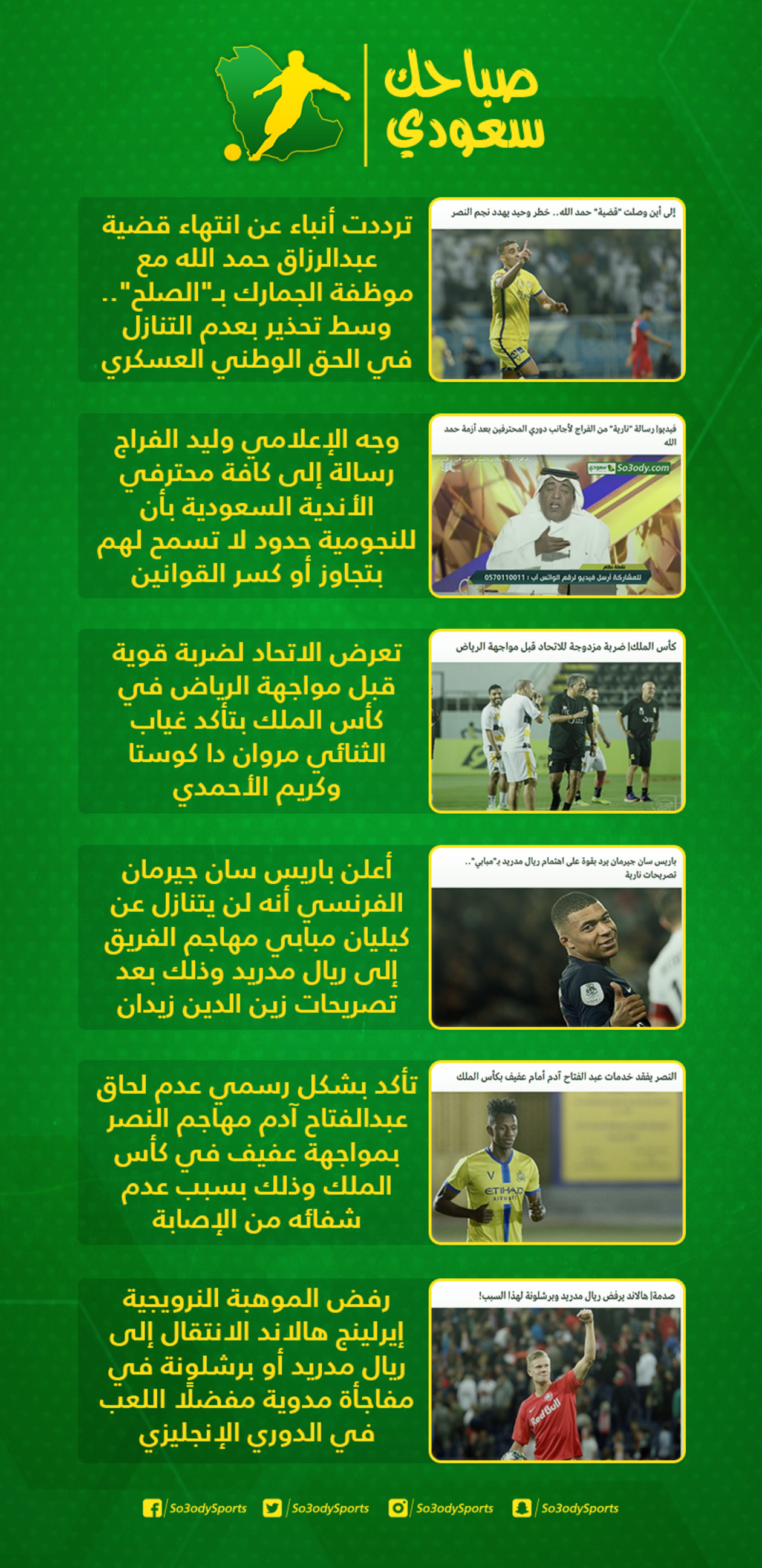 صباحك سعودي| تطور قضية حمد الله وصدمة الاتحاد.. وحسم انتقال مبابي إلى ريال مدريد