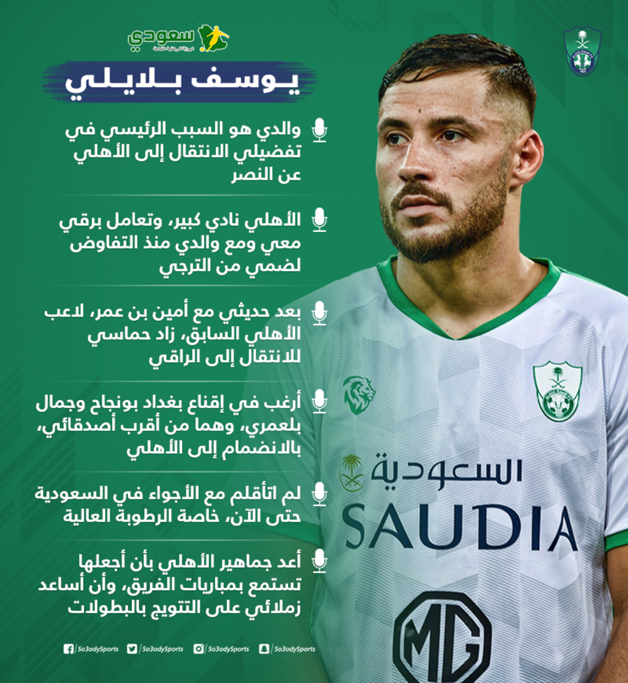 وأكد بلايلي في حوار مع صحيفة "البلاد"، أن والده كان العامل الرئيسي في انتقاله إلى الأهلي، رغم تلقيه عرضًا آخر من النصر، واعدًا بتحقيق البطولات مع الفريق، ومساعدته في جلب بعض الصفقات المدوية.