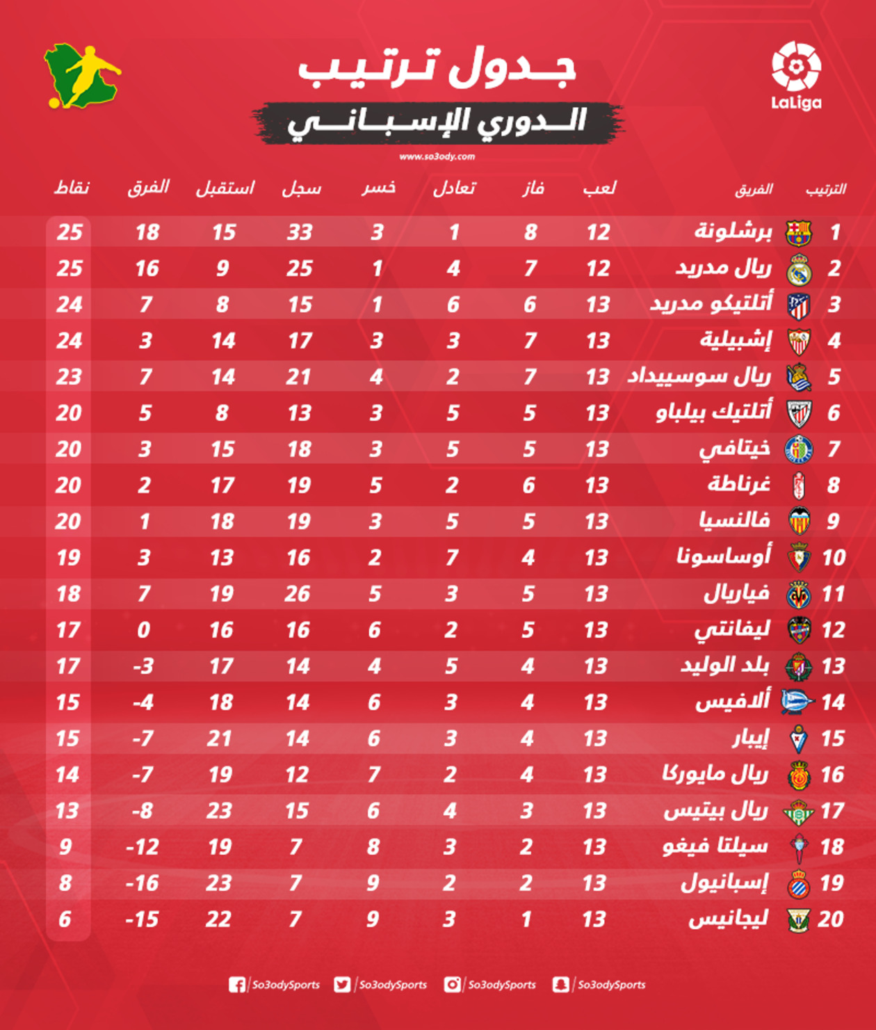 انتهت منافسات الجولة الثالثة عشر من الدوري الإسباني، باستمرار الصراع الساخن بين برشلونة وريال مدريد، على قمة الترتيب.