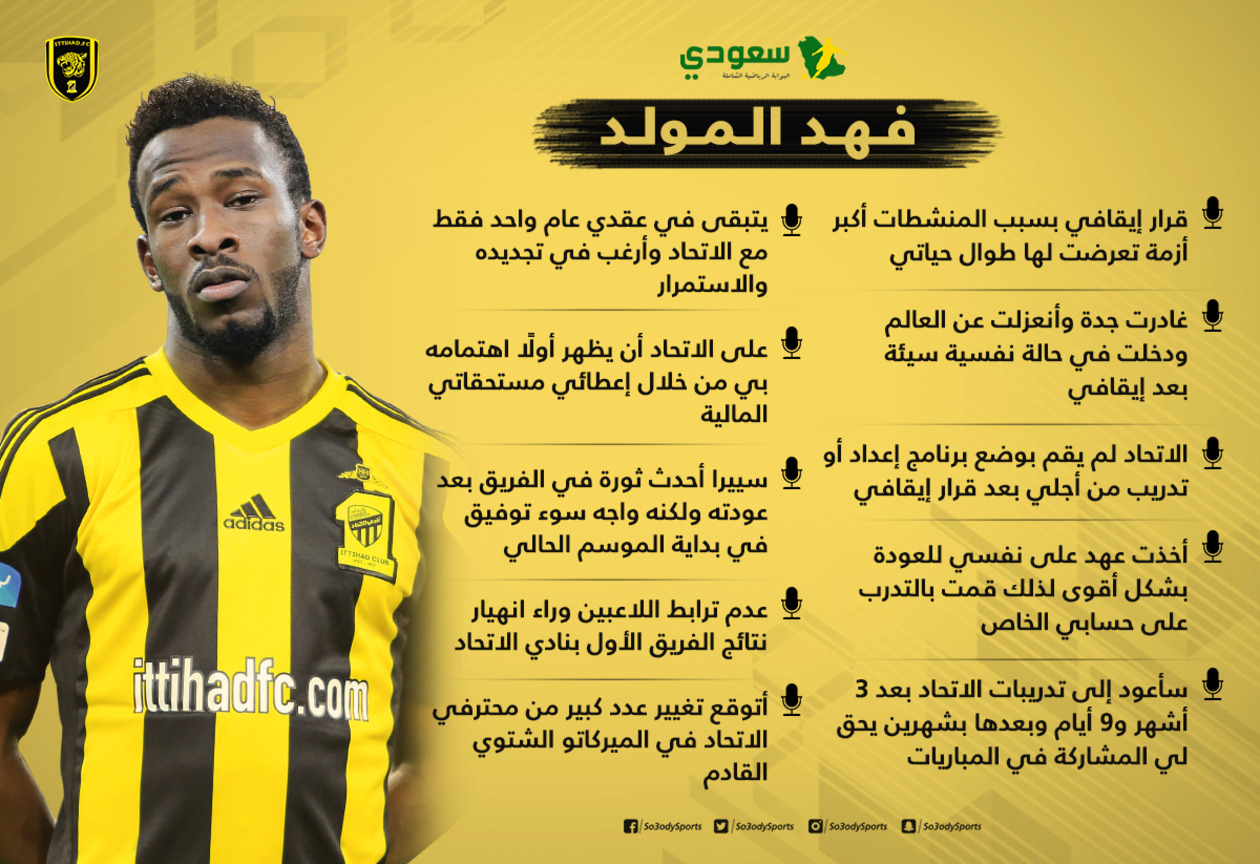 وأطلق المولد خلال الحوار الذي أجراه مع برنامج "في المرمى"، المذاع عبر فضائية "العربية"، مجموعة من القذائف سواء بشأن تعامل نادي الاتحاد معه، أو تجديد عقده مع الفريق، وأزمته النفسية التي دخل فيها بعد إيقافه.