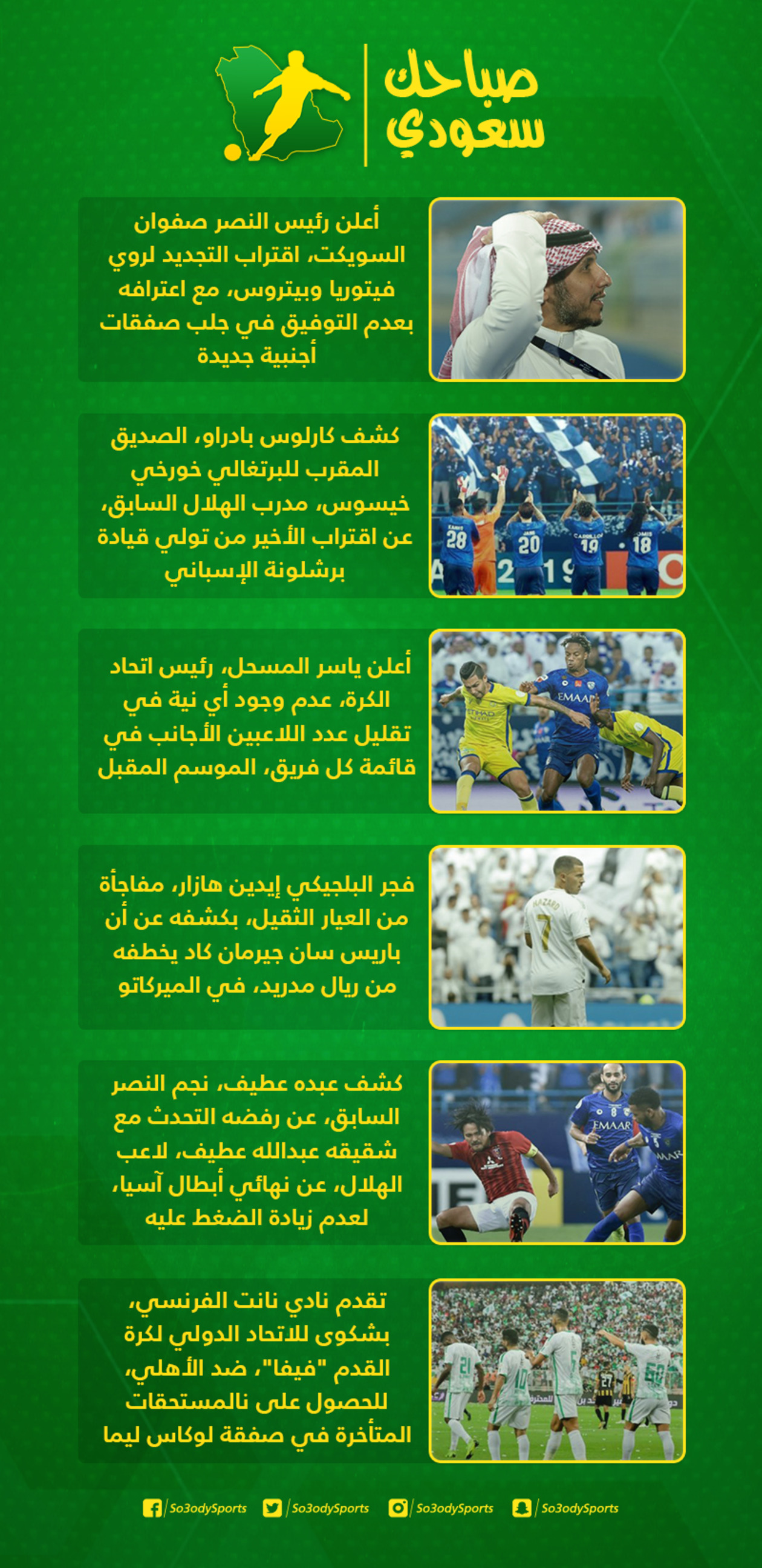 شهدت الساحة الرياضية المحلية والعالمية، خلال الـ24 ساعة المنقضية، عددًا من الأخبار التي حرص "سعودي سبورت" على الاهتمام بها، وتقديمها لمتابعيه، من أجل إلمامهم بالأحداث أول بأول.
