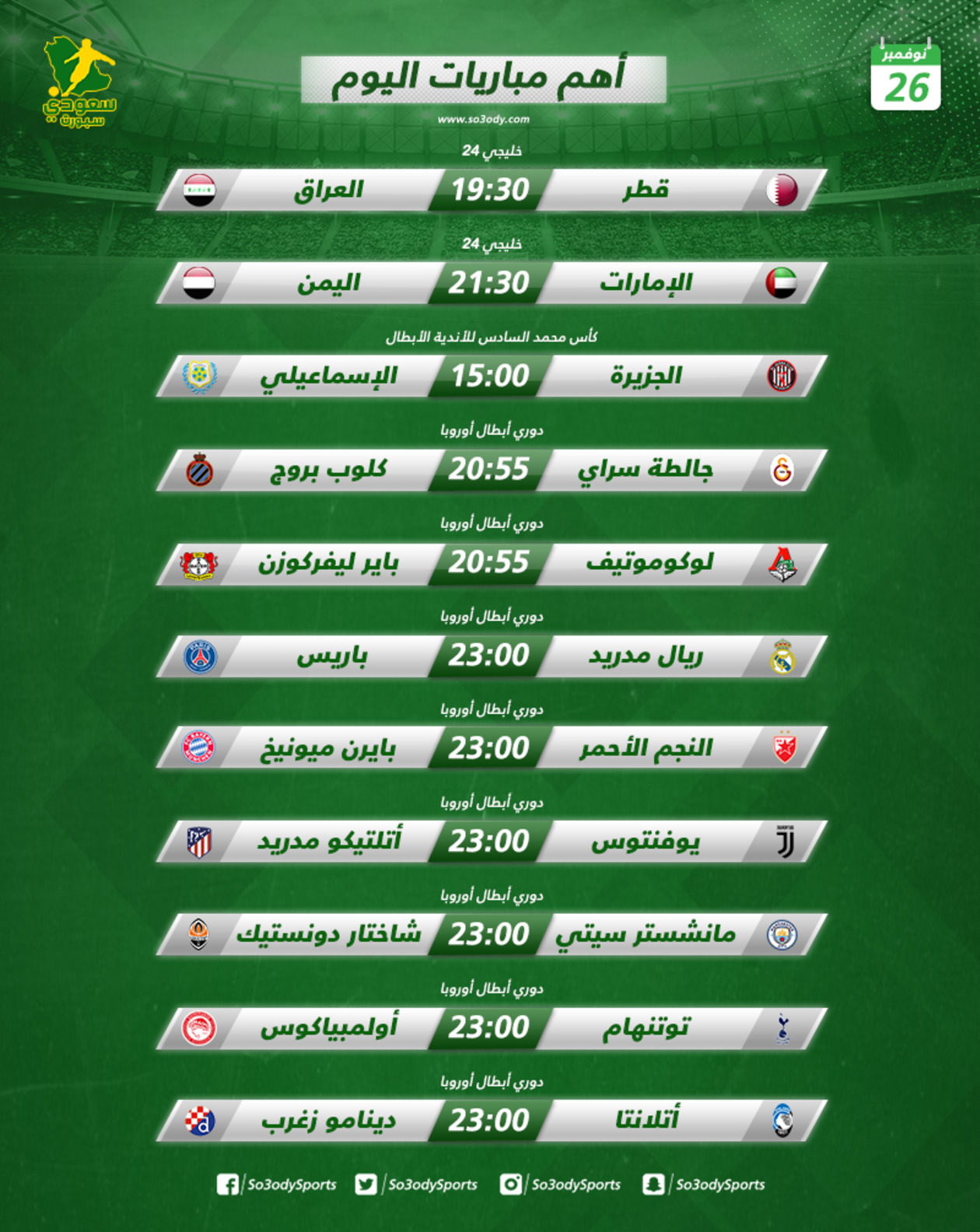 جماهير كرة القدم، أنتم على موعد اليوم الثلاثاء 26 نوفمبر 2019، مع عدد من المباريات الهامة، في مختلف البطولات على مستوى العالم.