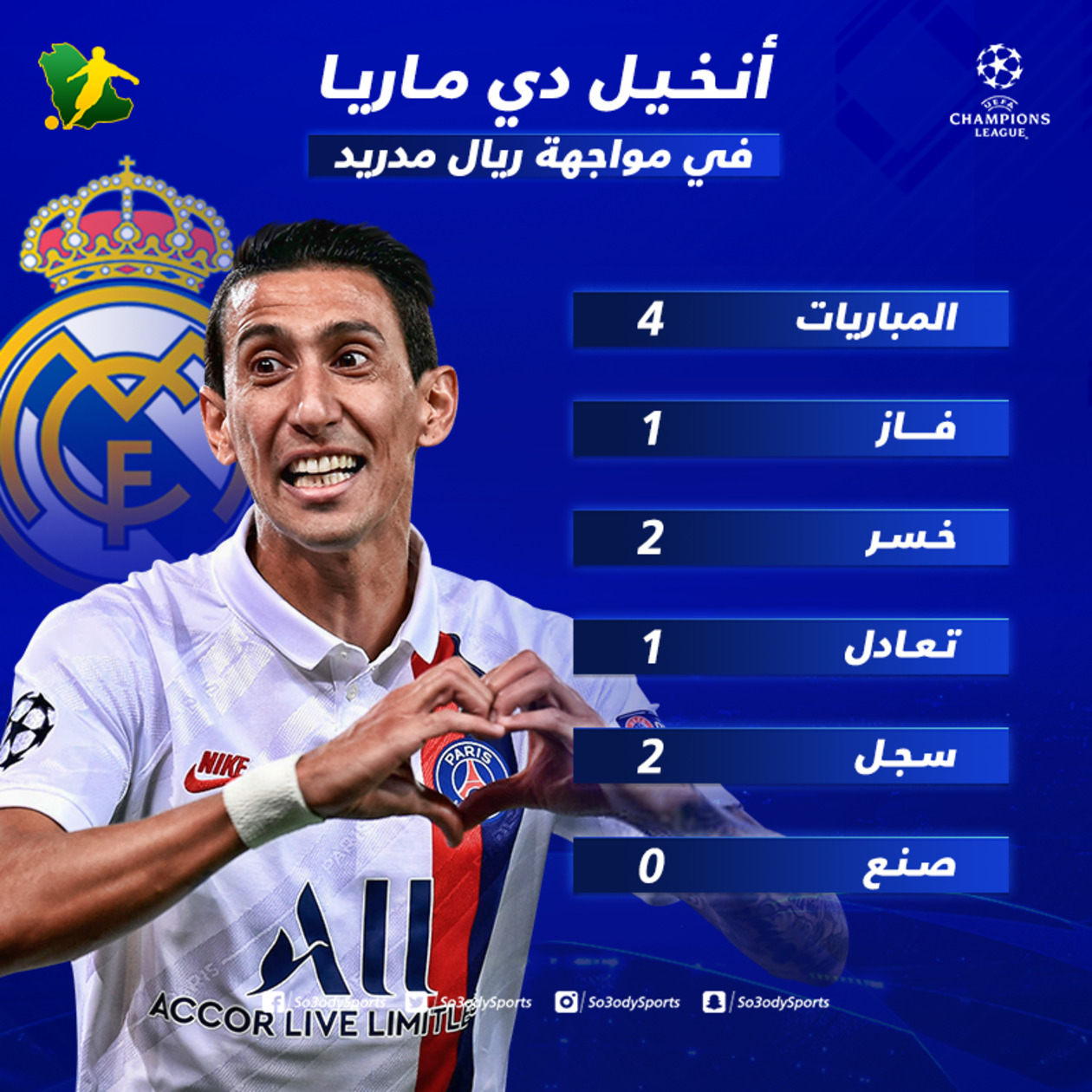 ونقدم لكم في "سعودي سبورت" انفوجراف توضيحي، يتضمن سجل دي ماريا أمام ريال مدريد.