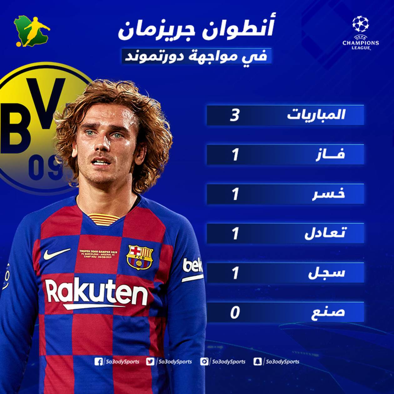 ويأمل البرسا أن يكون نجمه أنطوان جريزمان في حالة فنية جيدة في مبارارة ليلة، والتي ستكون الرابعة للنجم الفرنسي أمام دورتموند.