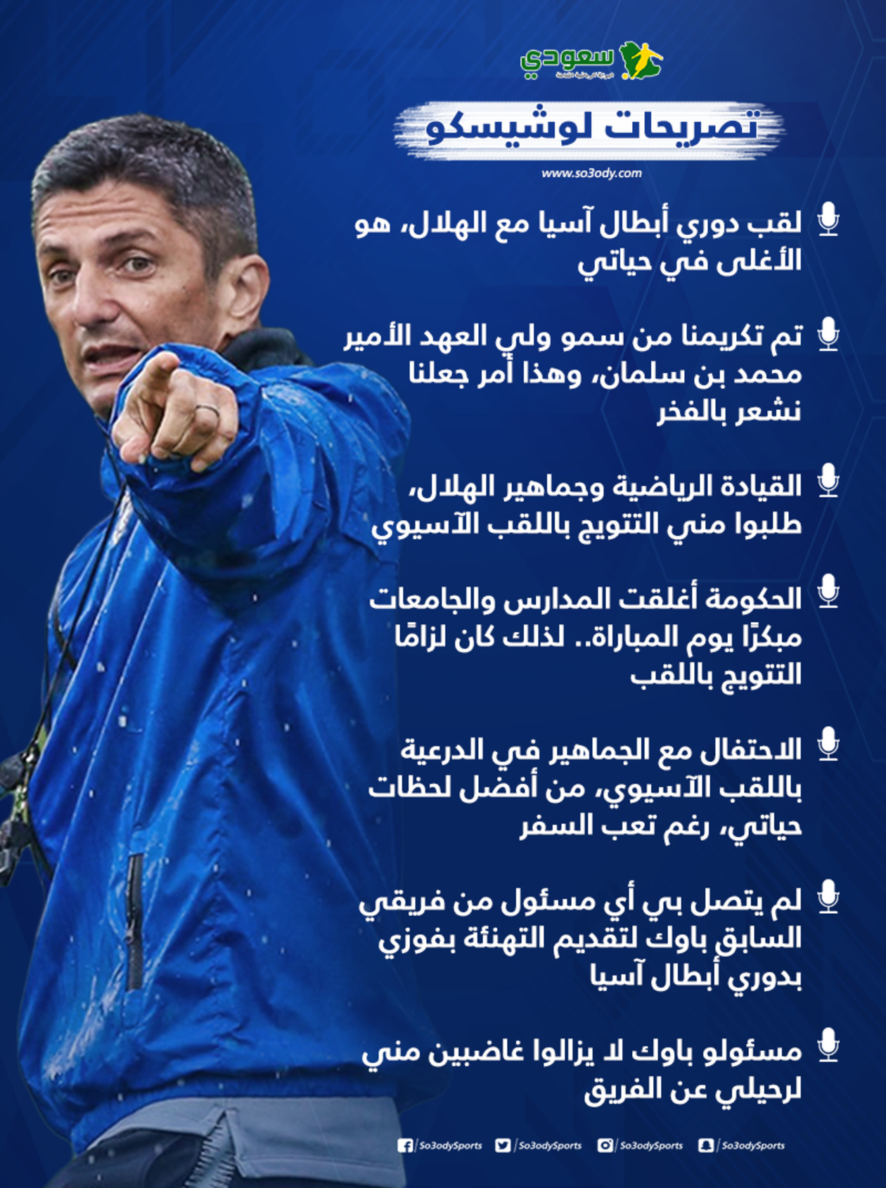 وشدد لوشيسكو في تصريحات لصحيفة "Digi sport" الرومانية، على أن التتويج باللقب الآسيوي، كان مطلب لجميع القيادة الرياضية في المملكة، وجماهير الهلال، ولذلك كان لزامًا عليه أن يقود الفريق لتحقيق هذا المجد.