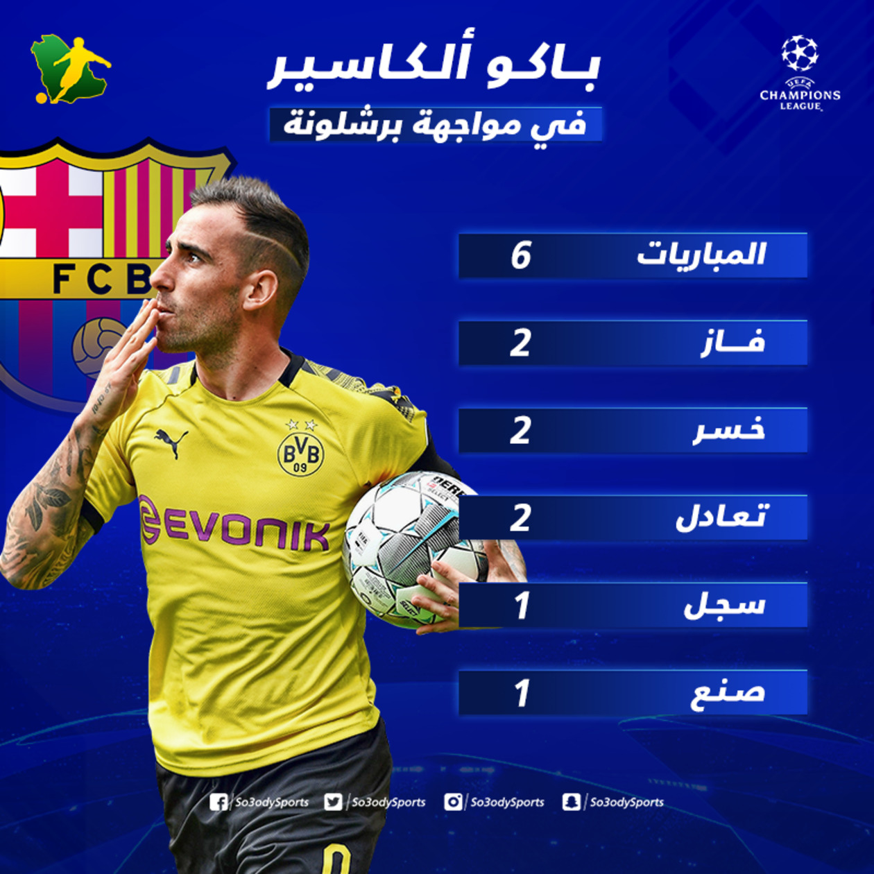 وستكون مباراة الليلة فرصة لمهاجم دورتموند باكو ألكاسير من أجل العودة لملعب فريقه السابق برشلونة، وهي مواجهة ستكون السابعة للمهاجم الإسباني أمام الكتالونيين.