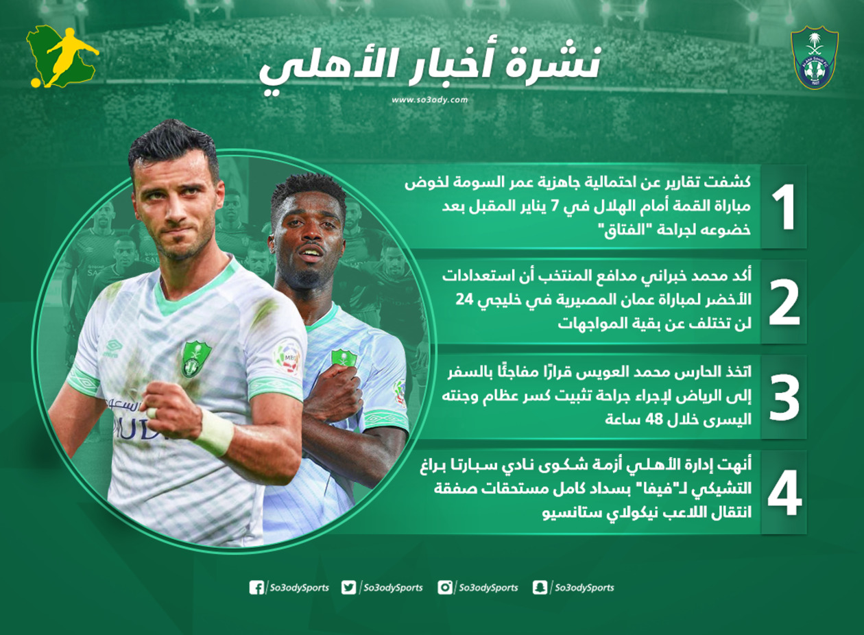 - كشفت تقارير عن احتمالية جاهزية عمر السومة لخوض مباراة القمة أمام الهلال في 7 يناير المقبل بعد خضوعه لجراحة "الفتاق"