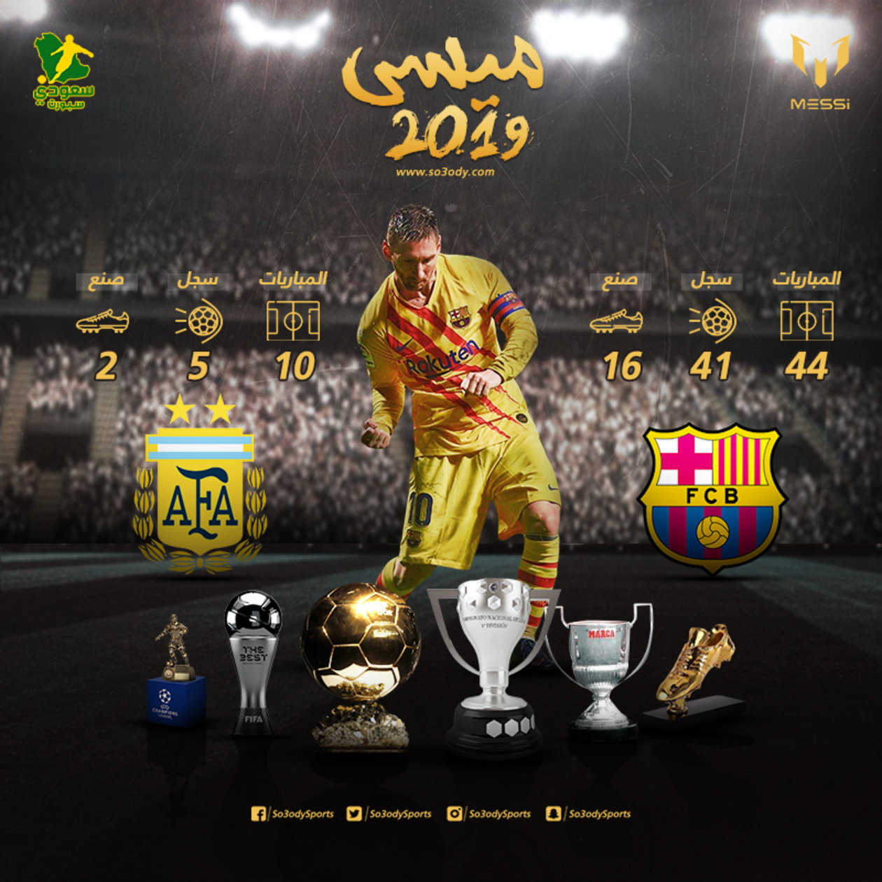 وسجل ميسي 41 هدفا قابلين للزيادة مع برشلونة عام 2019، كما صنع 16 آخرين في 44 لقاء، فيما سجل 5 أهداف وصنع 2 في 10 مباريات مع الأرجنتين.