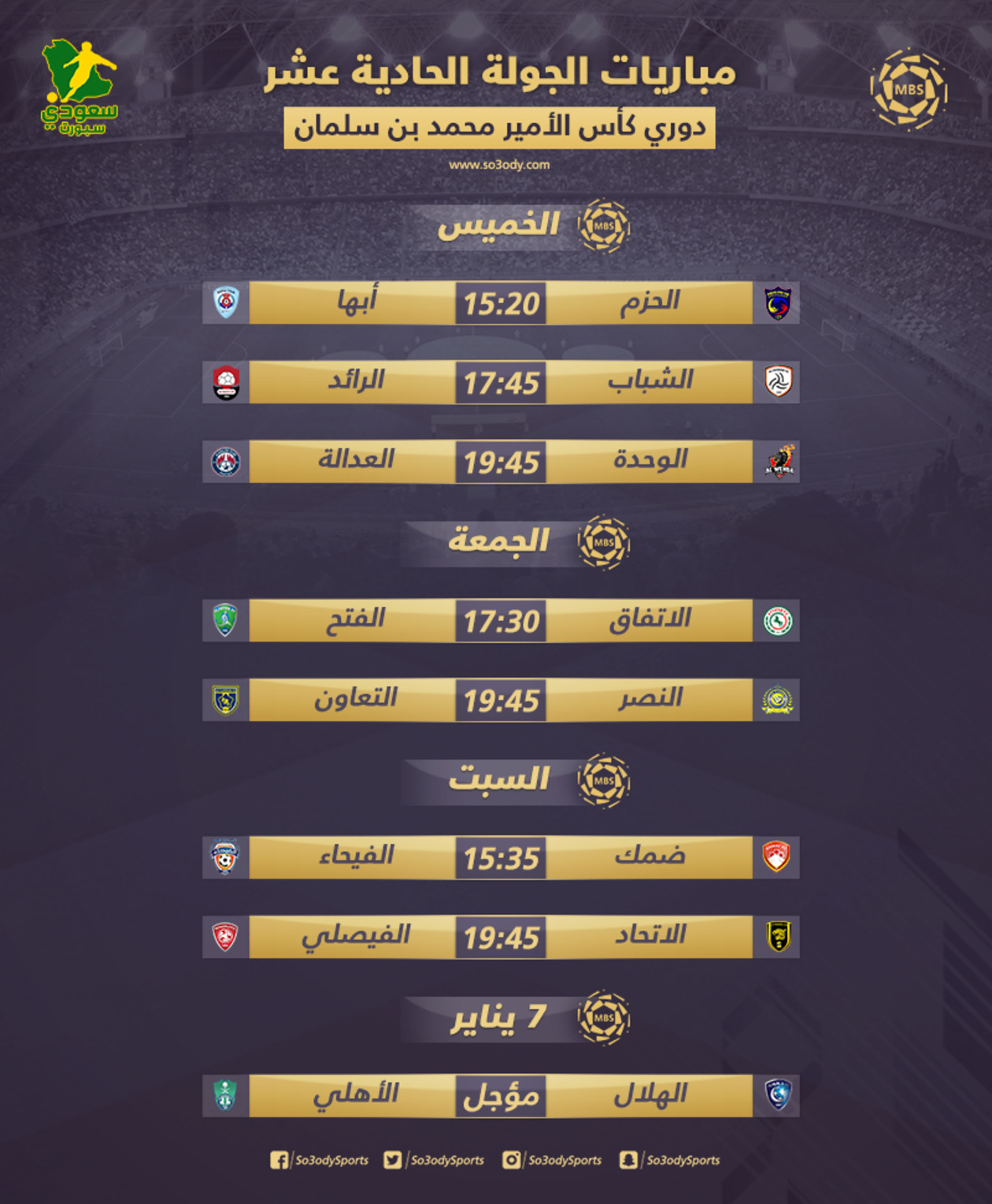تنطلق اليوم "الخميس"، منافسات الجولة الحادية عشرة من مسابقة دوري كأس الأمير محمد بن سلمان للمحترفين.